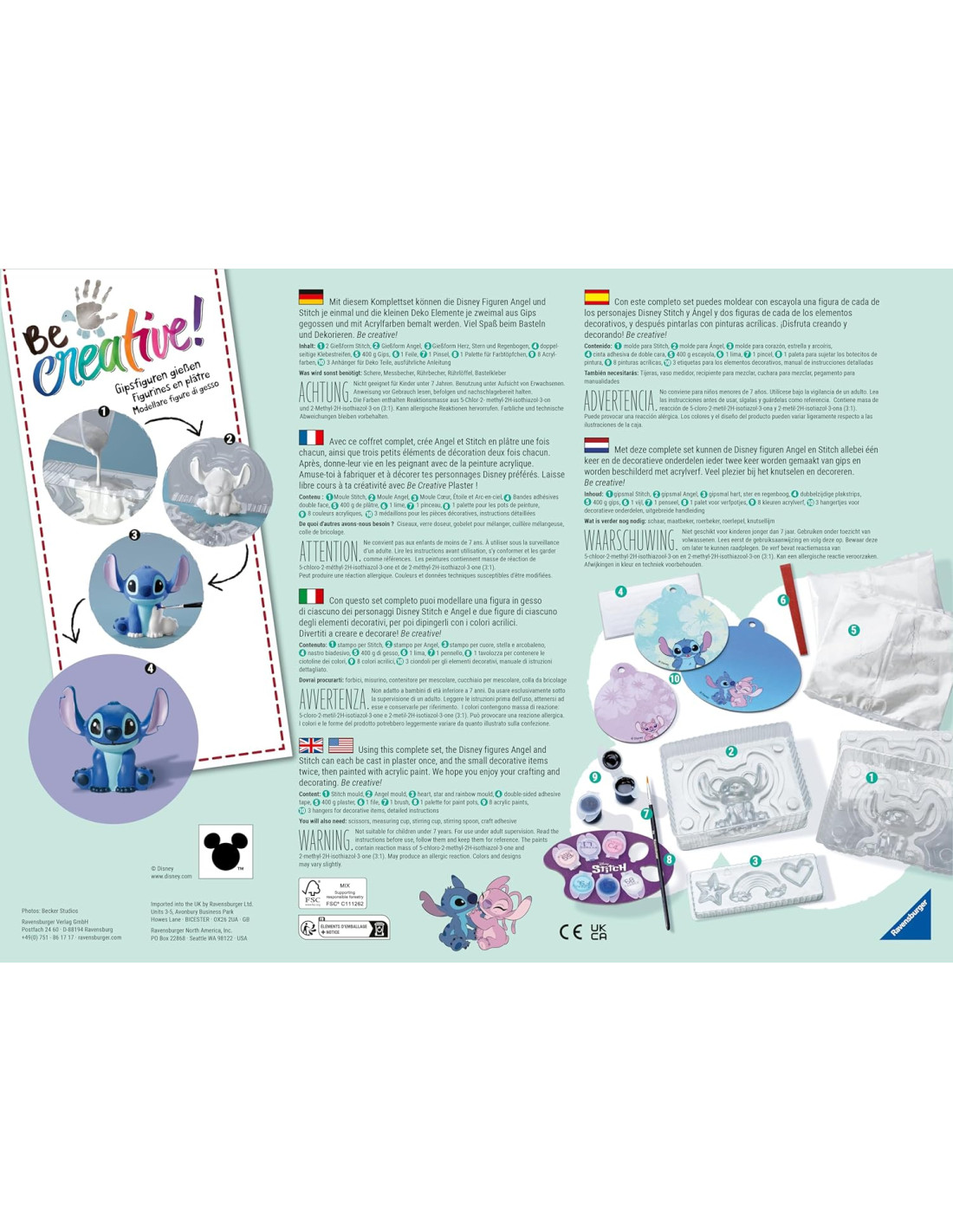 KIT COMPLETO PER IL FAI-DA-TE: grazie agli stampi per colata in gesso, stampi a cuore, a stella e ad arcobaleno, polvere di gesso e tanti altri strumenti, potrai creare e dipingere la tua scultura in gesso di Stitch