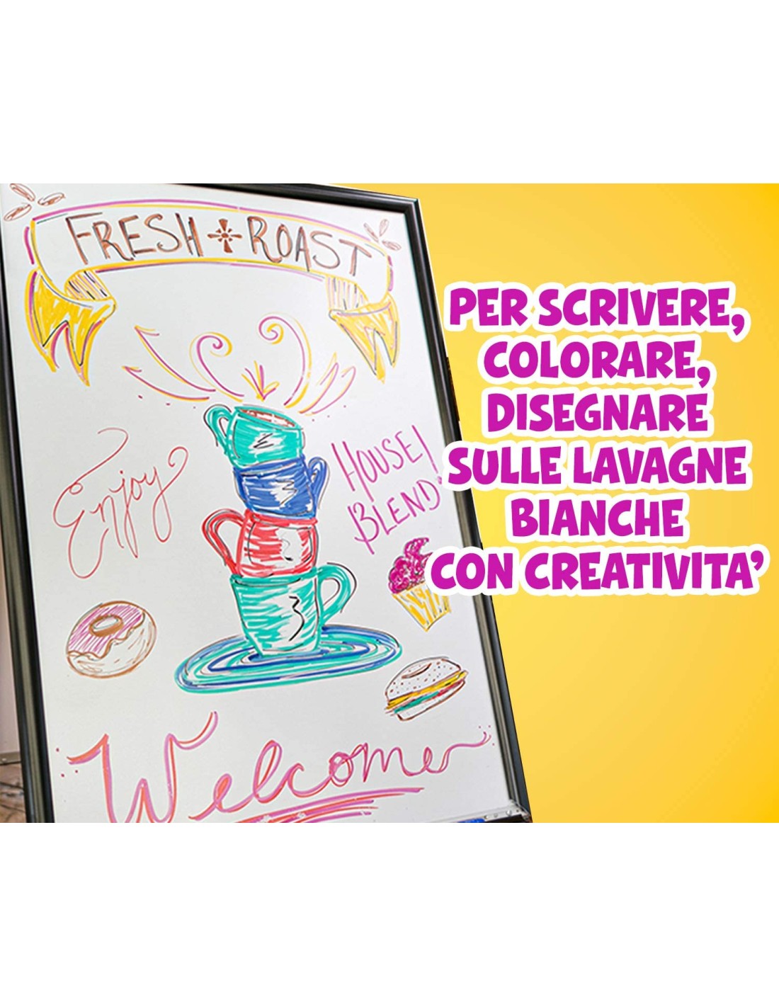 CRAYOLA COLOUR WIPEOFFS: Pennarelli specifici per Lavagna Bianca SICURI E LAVABILI: appositamente formulati per essere utilizzati anche dai bambini SI CANCELLANO FACILMENTE: si lavano anche facilmente da mani e vestiti 8 COLORI: giallo, arancione, rosso, azzurro, verde, rosa, marrone, nero PUNTA MAXI CONICA: per scrivere con tratto spesso o fine a seconda dell'inclinazione