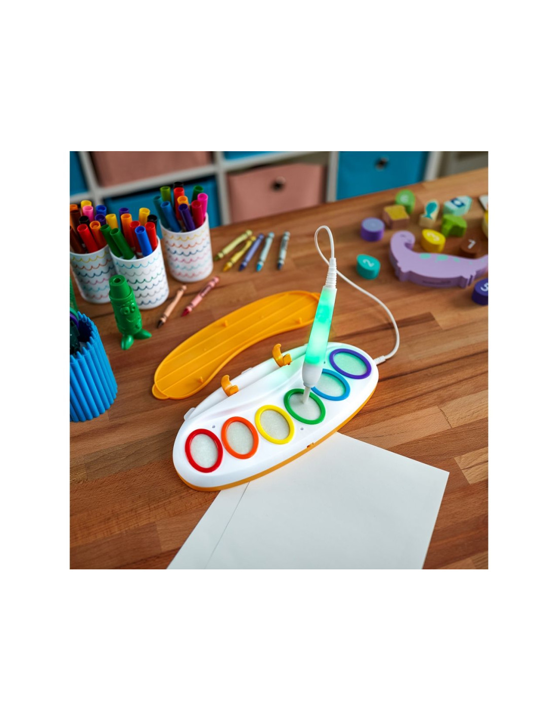 Facile e divertente: basta intingere il pennello nel tamponcino di colore e il fusto si illumina a seconda del colore scelto; passando il pennello sulla carta, si vedrà il colore apparire magicamente; l'unità ha un design compatto e portatile ed è richiudibile con l'apposito coperchio per evitare che il colore si secchi