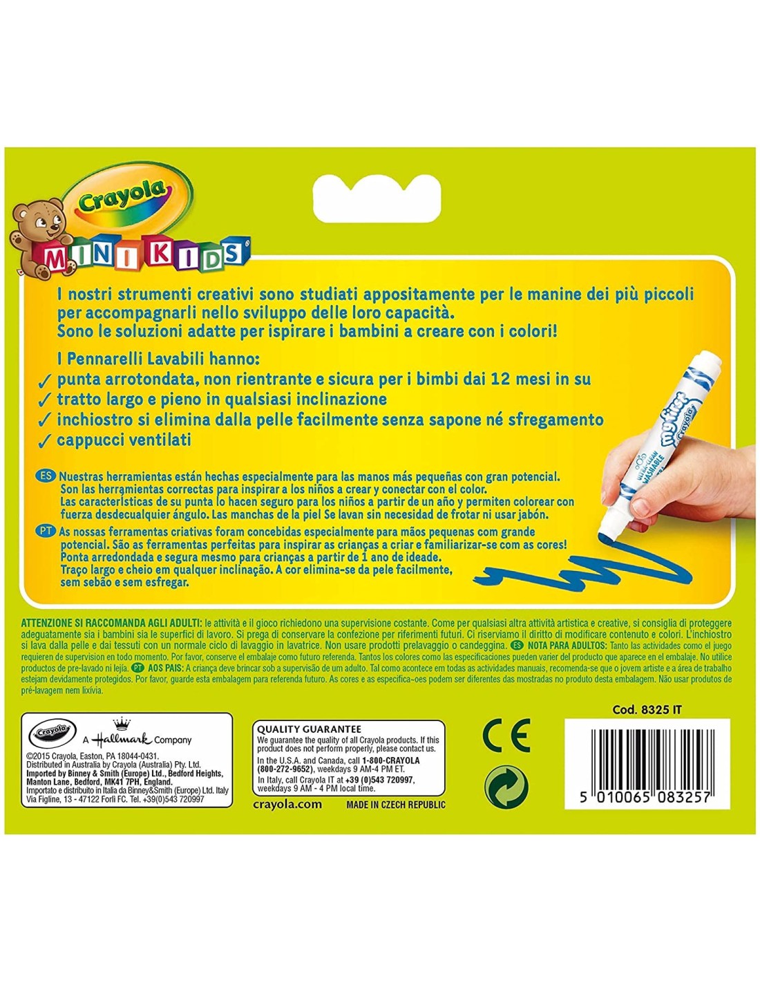 Misura: 12 Pezzi I Pennarelli Crayola Mini Kids sono appositamente studiati per i bambini più piccoli a partire da 12 mesi grazie alla speciale punta arrotondata di sicurezza e non rientrante. Gli inchiostri inoltre sono super lavabili dalle mani anche senza sapone e si rimuovono facilmente anche dai tessuti. La linea Mini Kids è dedicata ai più piccoli che si affacciano per la prima volta al mondo del colore ed è caratterizzata da prodotti specifici e sicuri adatti alle loro necessità per sviluppare manualità , creatività e senso del colore. no Visualizza tutta la prodotto -Crayola Mini Kids Pennarelli con punta in fibra arrotondata non rientrante a prova di urto, sicuri e atossici -Tratto largo e pieno con qualsiasi inclinazione -12 colori assortiti brillanti e vivaci -Inchiostri super lavabili da pelle e vestiti -Ottimi per i bambini più piccoli dai 12 mesi, sia allasilo che a casa Crayola Mini Kids Pennarelli con punta in fibra arrotondata non rientrante a prova di urto, sicuri e atossici Tratto largo e pieno con qualsiasi inclinazione 12 colori assortiti brillanti e vivaci Inchiostri super lavabili da pelle e vestiti Ottimi per i bambini più piccoli dai 12 mesi, sia allasilo che a casa