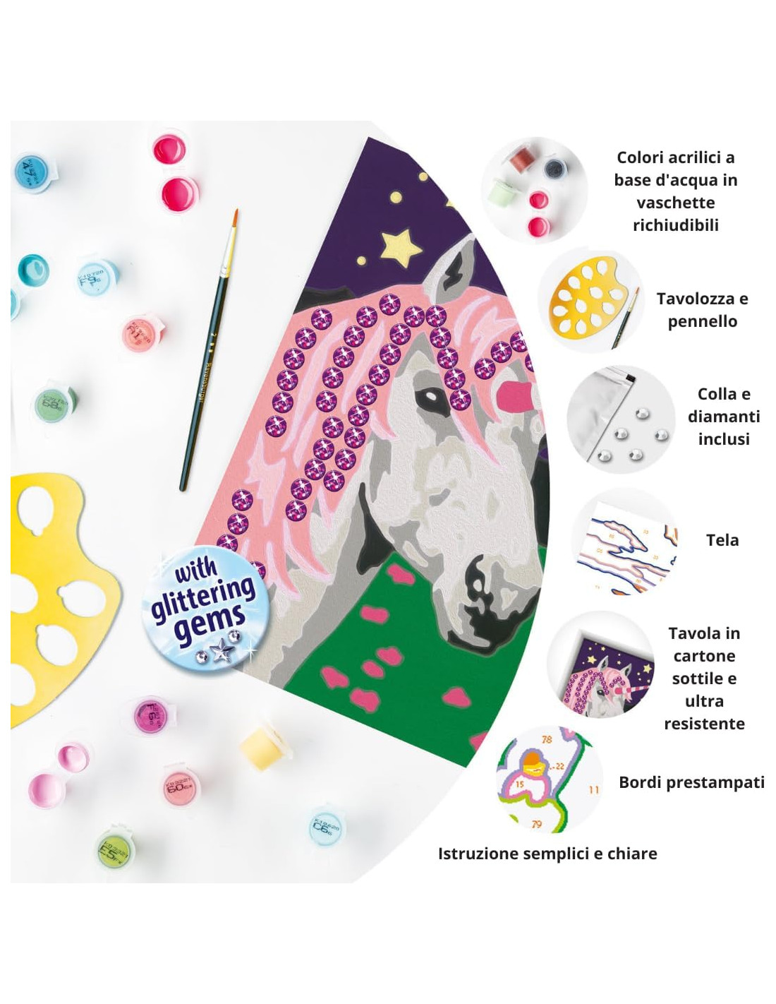 KIT DI PITTURA PER PICCOLI ARTISTI CON UNICORNO: il kit comprende la tavola prestampata, i colori acrilici a base d'acqua in vaschette richiudibili e un porta tempere; il pennello e la cornice sono inclusi