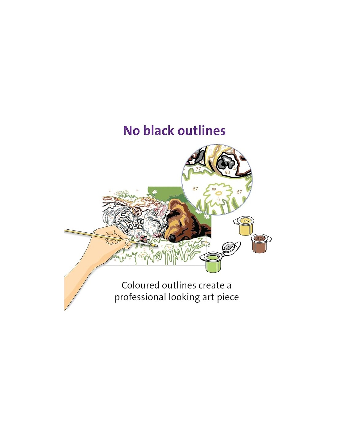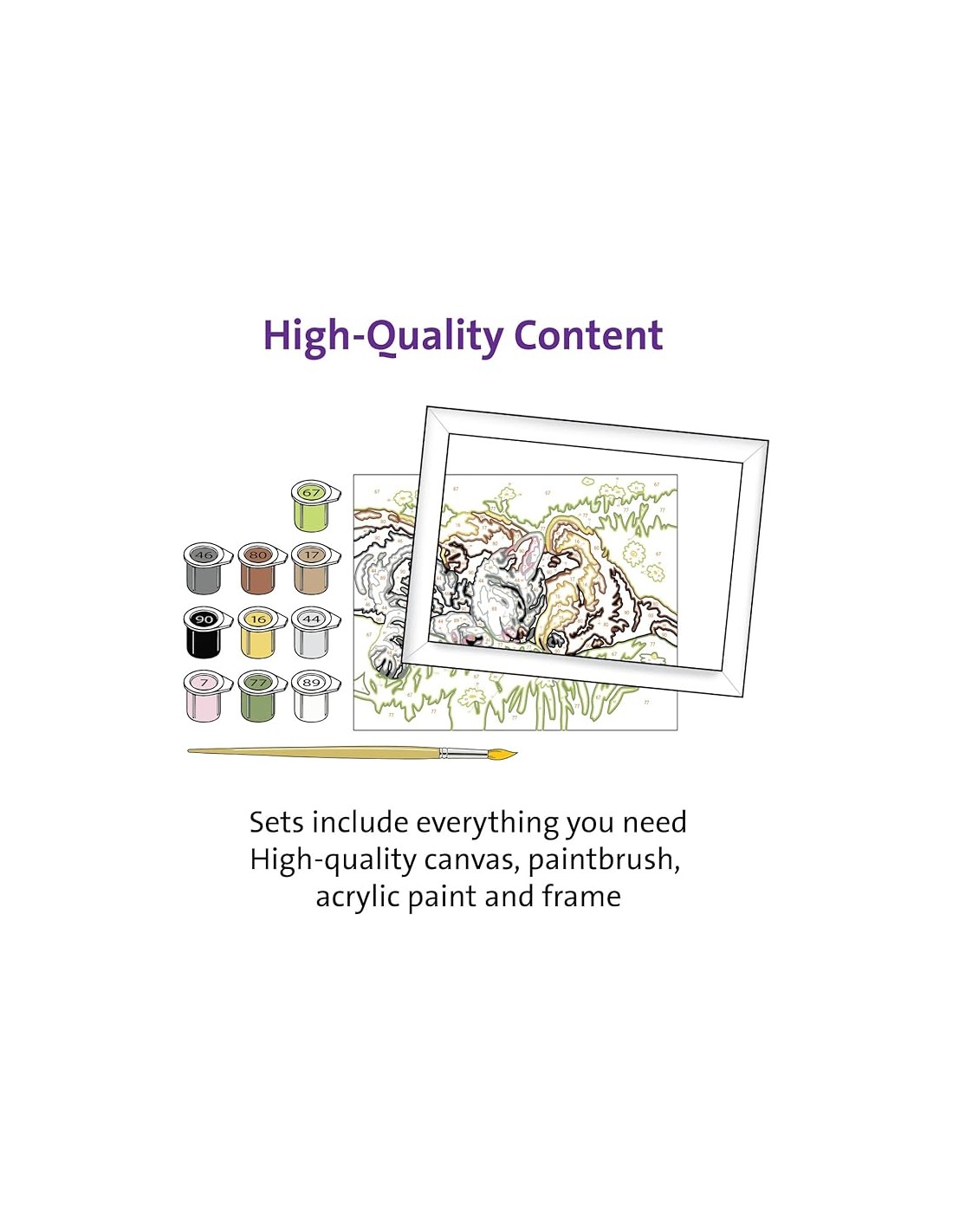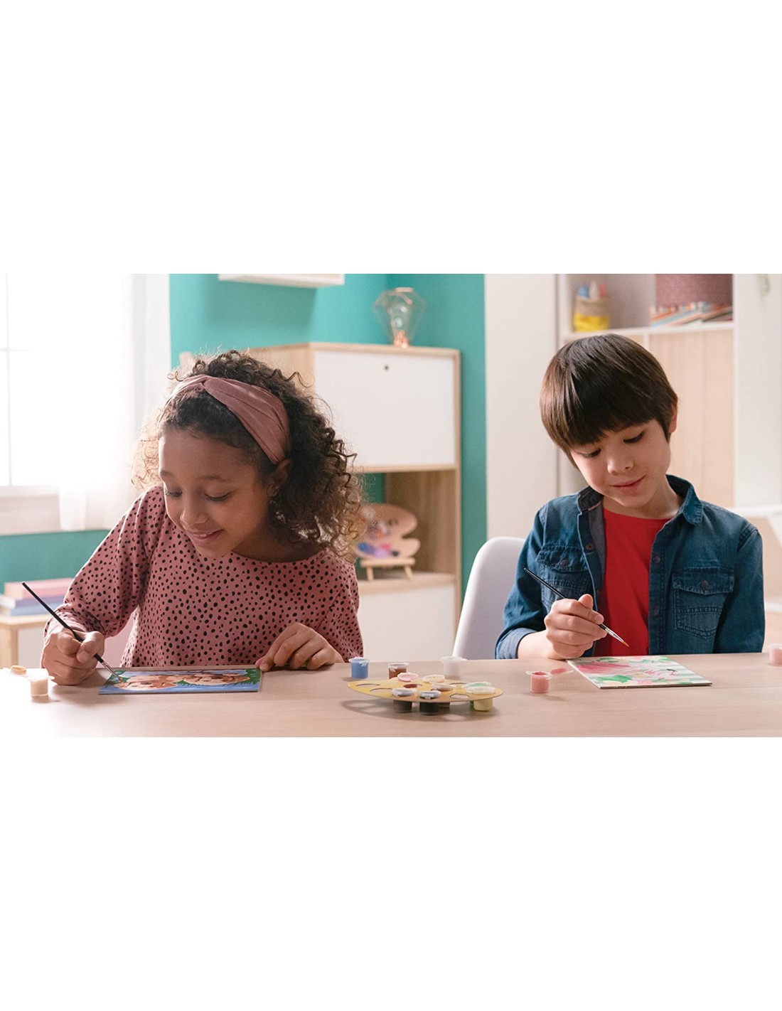Tutti possono dipingere, la tavola è già prestampata e contiene un tracciato che guida l'attività con numeri e bordi colorati da riempire con i corrispondenti colori I colori a base d'acqua sono pronti per l'uso e non necessitano alcun solvente I barattoli di colori sono richiudibili singolarmente per evitare che si secchino, per facilitare l'attività, viene fornito una tavolozza di cartone dove inserire i barattolini per evitare che si rovescino La cornice è già inclusa, una volta terminato il quadro, basta farlo asciugare per poi incorniciarlo e decorare la propria cameretta Attività rilassante che esercita la manualità fine e la concentrazione e garantisce un risultato impeccabile, che da grande soddisfazione a tutti i piccoli artisti