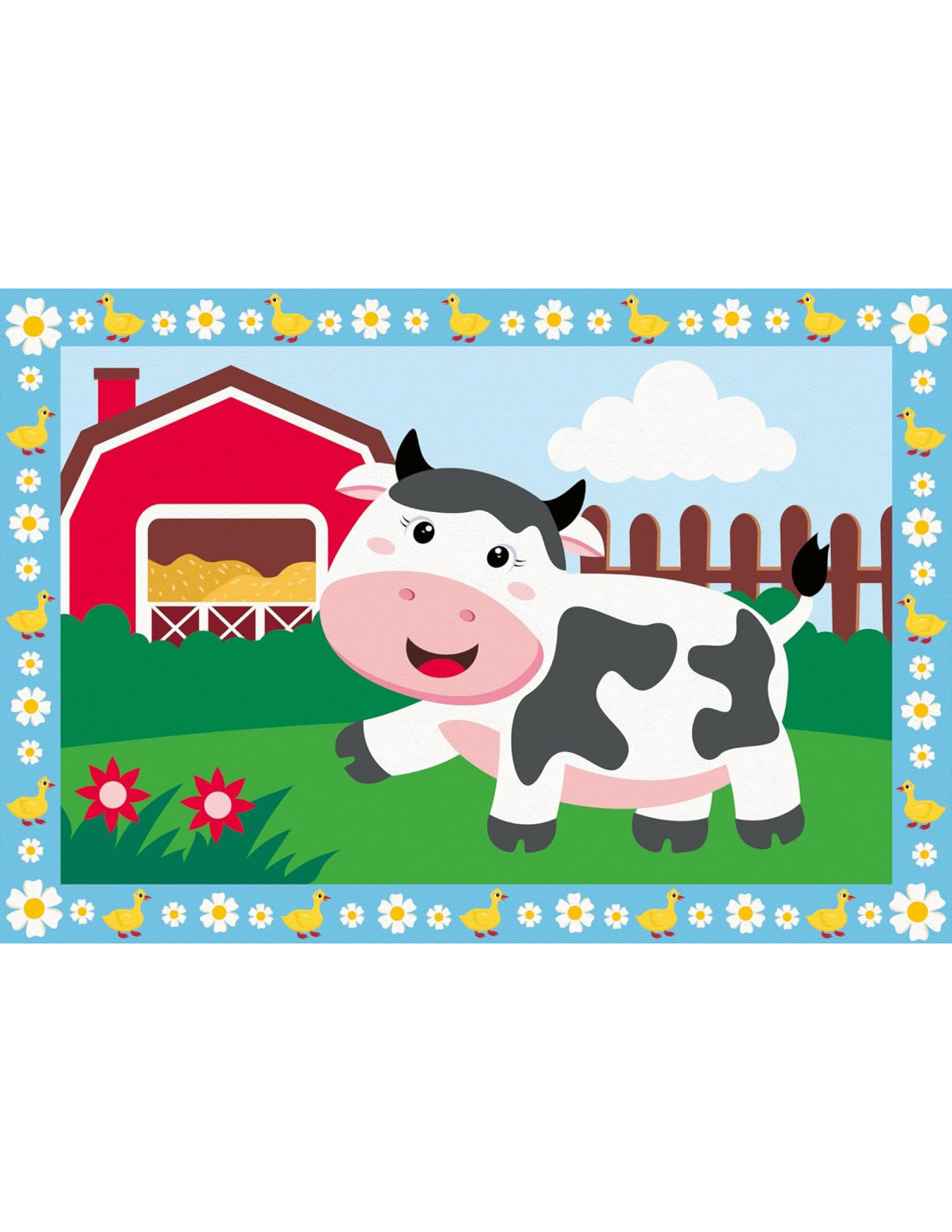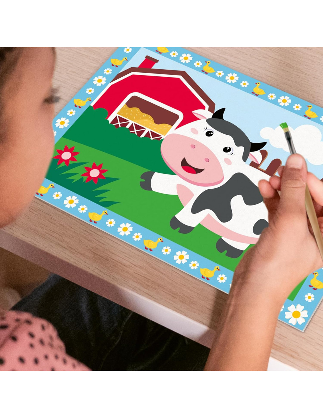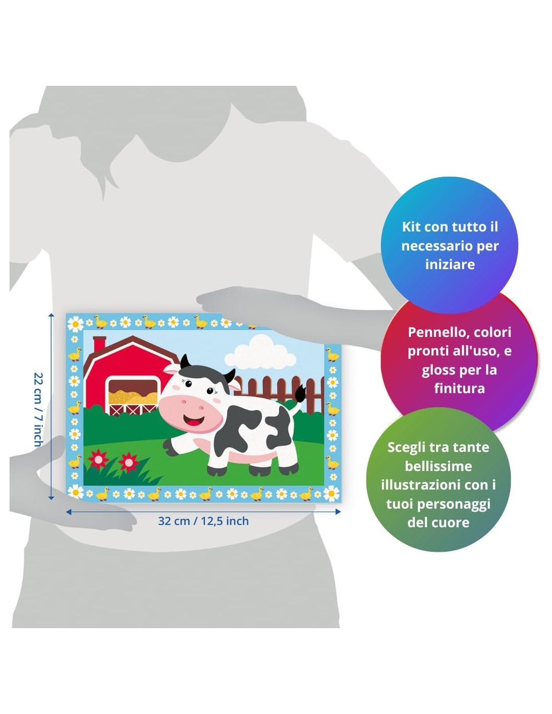 KIT DI PITTURA PER PICCOLI ARTISTI A TEMA FATTORIA: il Kit CreArt Junior comprende colori acrilici ad acqua in vaschette richiudibili, 1 tavolozza, 2 tavole prestampate con bordi decorati, 1 pennello a setole larghe e un manuale d'istruzioni