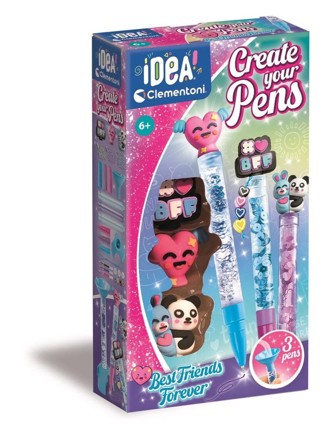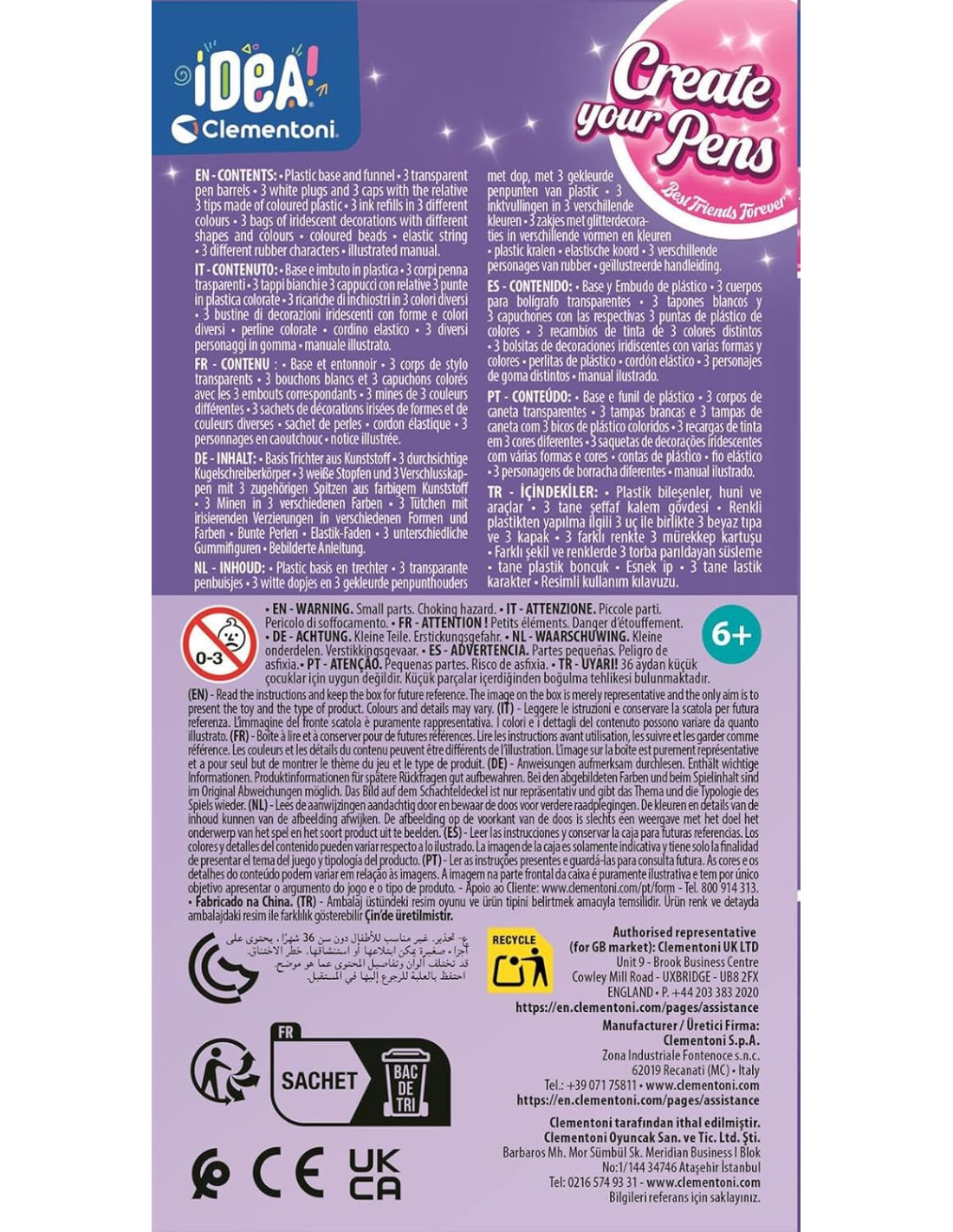 COSA CONTIENE: gioco ideato, progettato e sviluppato in Italia, con 3 penne da decorare con tappi, cappucci, inchiostri, decorazioni iridescenti, perline, cordini elastici e 3 personaggi diversi, con manuale per guidare nella composizione