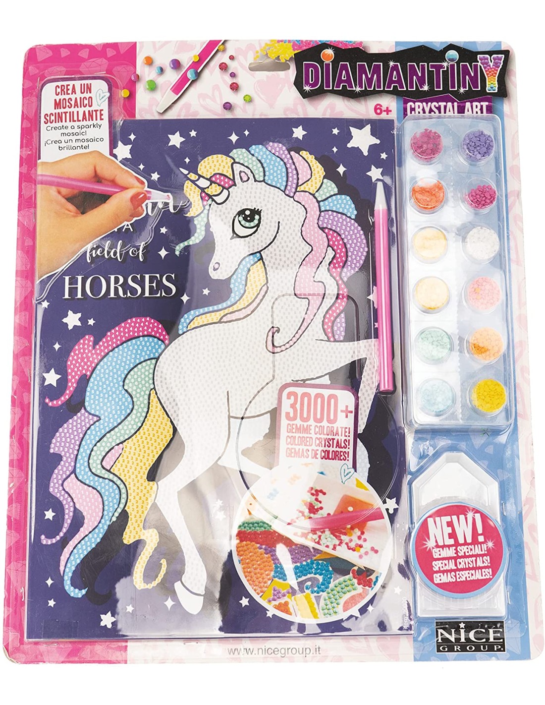 Età consigliata: 8+ Mosaico da decorare con cristalli colorati. Contiene, una tavola con disegnato un unicorno, cristalli scintillanti di vari colori, penna applicatore e vassoio raccoglitore. Divertititi e realizza il tuo quadretto scintillante!