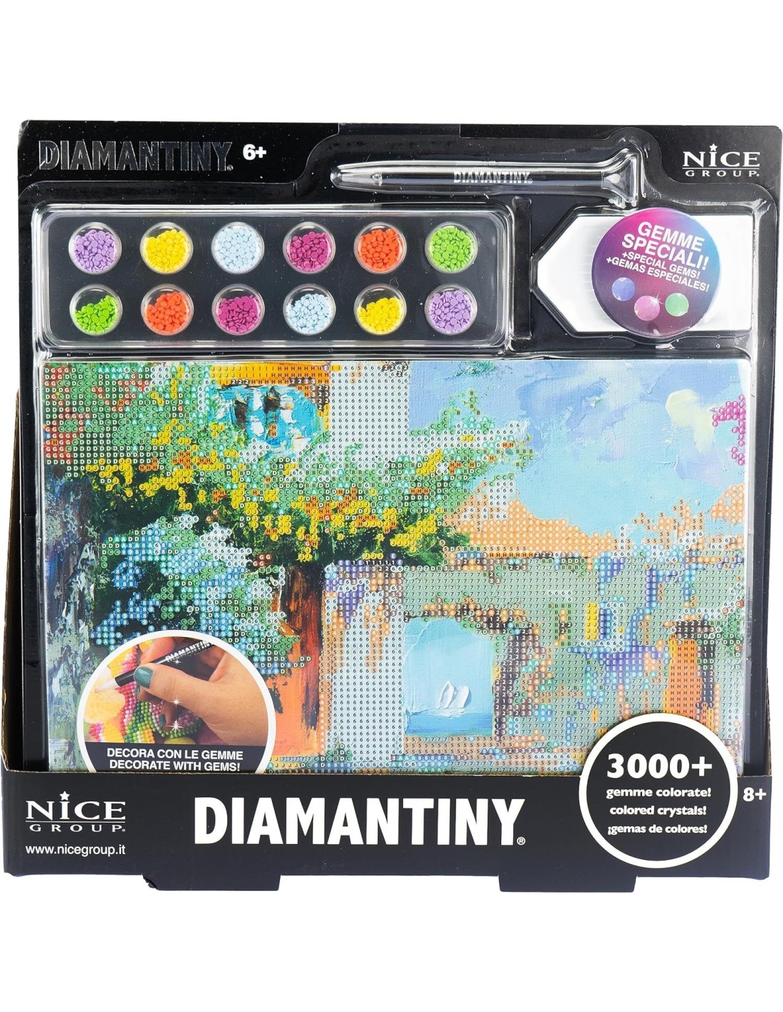 DIAMANTINY LEVEL UP: è l'attività crystal art per creare mosaici fai-da-te, in rilievo, con coloratissime gemme 3D. Disponibile nella versione LANDSCAPE Painting Italian Country da gemmare. TECNICA: per decorare il mosaico del Paesaggio Paese al Mare effetto acquerello devi utilizzare la tecnica "crystal art, colora con i numeri”, applicando le gemme ai numeri. Il foglio di istruzioni ti guida nell'applicazione. FUNZIONE: questa attività è molto semplice e rilassante. Aiuta i bambini e i giovani a sviluppare la manualità, la coordinazione e la concentrazione.