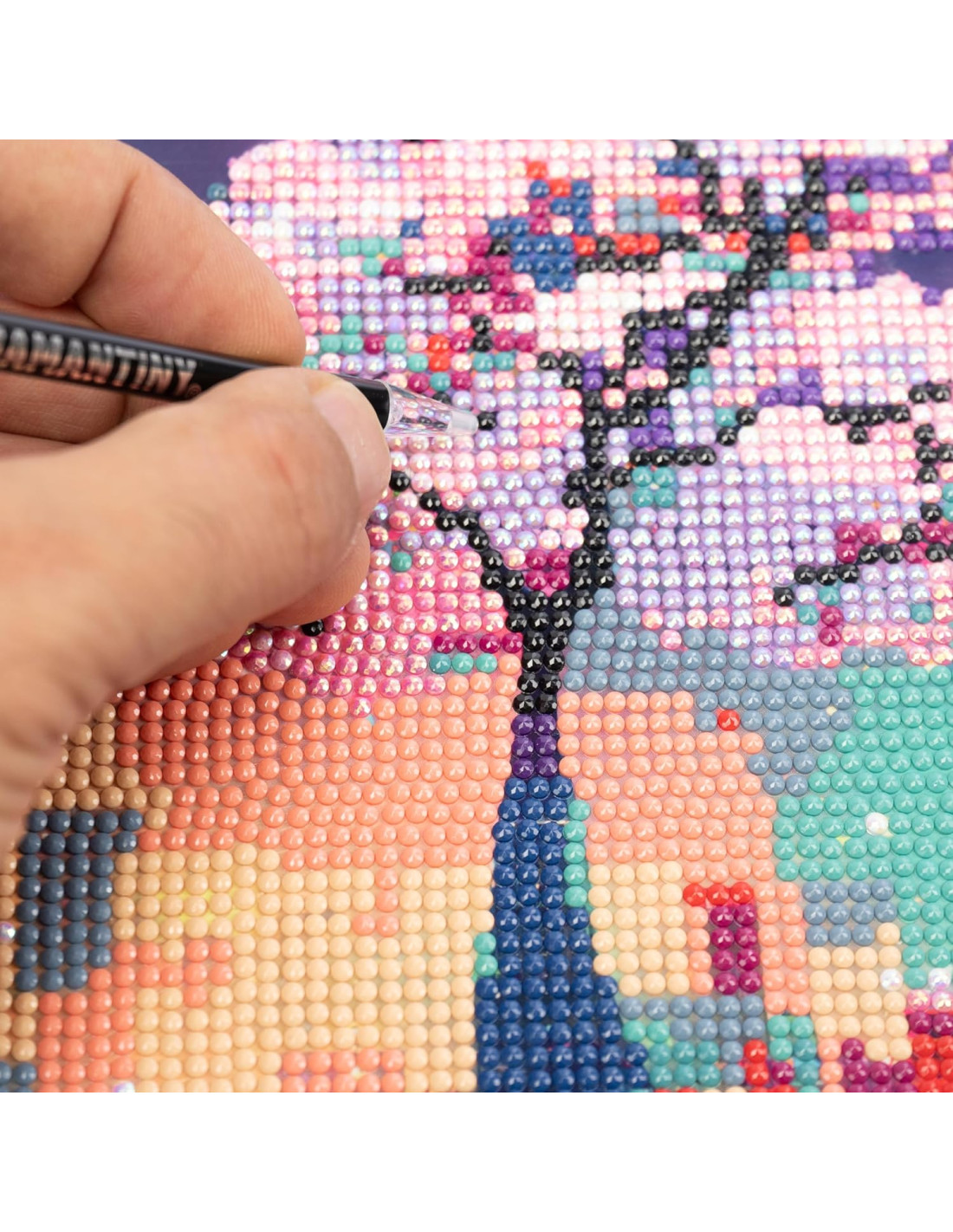 CONTENUTO: il set contiene 1 quadretto di cm 21 x 29,5 con base adesiva e guida colore, 3000+ cristalli colorati, 1 vassoio raccoglitore, 1 penna con cui applicarli e 1 quadratino di cera.