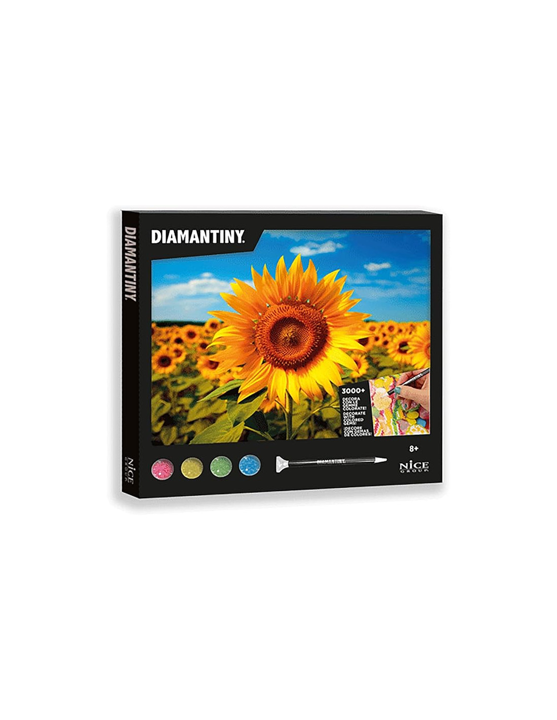 DIAMANTINY LEVEL UP: è l'attività crystal art per creare mosaici fai-da-te, in rilievo, con coloratissime gemme 3D. Disponibile nella versione QUADRO Sunflowers da gemmare. TECNICA: per decorare il mosaico a forma di quadretto Canvas Fiori Girasole da appendere devi utilizzare la tecnica "crystal art, colora con i numeri”, applicando le gemme ai numeri. Il foglio di istruzioni ti guida nell'applicazione. FUNZIONE: questa attività è molto semplice e rilassante. Aiuta i bambini e i giovani a sviluppare la manualità, la coordinazione e la concentrazione. CONTENUTO: il set contiene 1 quadretto di cm 32 x 30 con base adesiva e guida colore, 3000+ cristalli colorati, 1 vassoio raccoglitore, 1 penna con cui applicarli e 1 quadratino di cera. Età consigliata: 8+