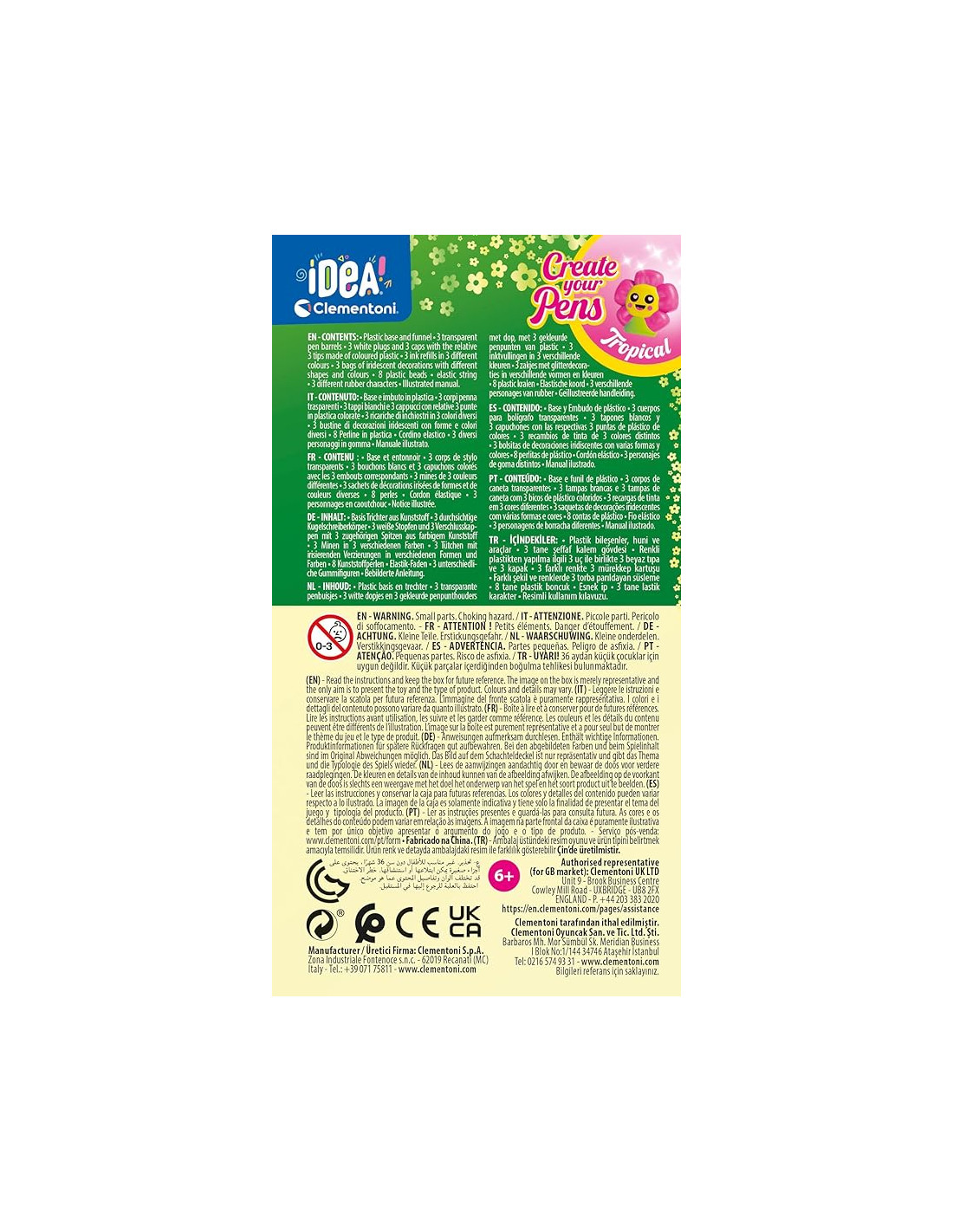 LABORATORIO PENNE: Un originale kit creativo che permette di assemblare 3 penne e personalizzarle con diverse decorazioni in stile tropicale CONTENUTO DEL GIOCO: 3 penne, 4 inchiostri di diversi colori, 3 personaggi, manuale illustrato e tutti gli strumenti per realizzarle PENNE IDEA PERSONALIZZABILI: Il nuovo gioco di Idea consente di creare e personalizzare le proprie penne con tanti accessori e decorazioni. Disponibile in 3 varianti, tutte da collezionare! Questo è un set ricambio per il laboratorio delle penne Clementoni BENEFICI DEL GIOCO: Un concetto che va oltre la semplice attività di personalizzare la propria penna. Si può creare dando sfogo alla fantasia, stimolando così la creatività, la manualità e l'immaginazione DETTAGLI: Un laboratorio creativo ideato e progettato in Italia. Consigliato per bambine a partire dai 6 anni