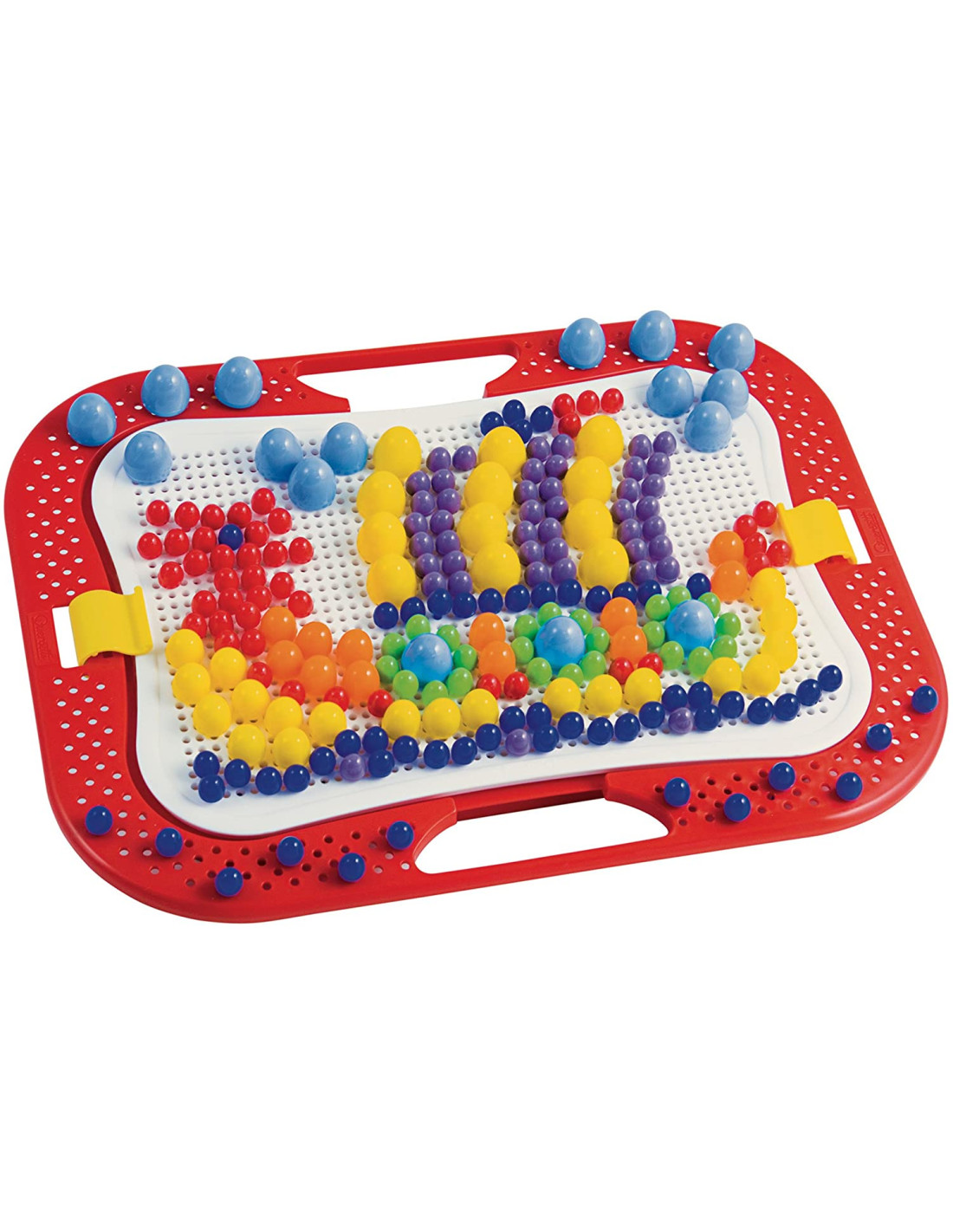 Contiene 300 chiodini in 5 colori, 1 tavoletta traforata, 1 comodo cestello con maniglia, 1 album di esempi