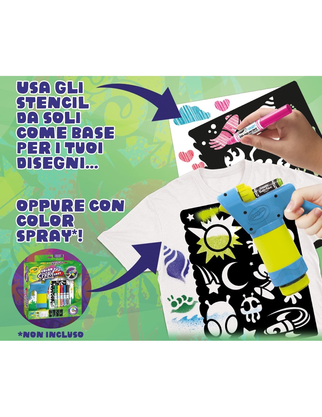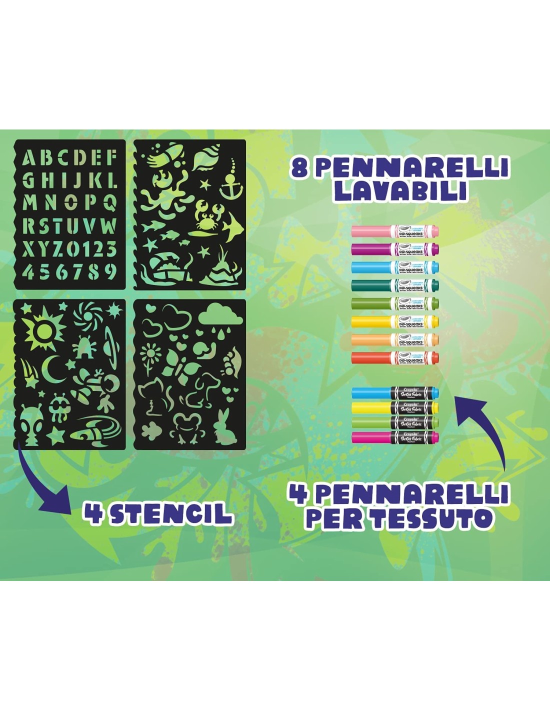 CRAYOLA SET RICARICA PENNARELLI E STENCIL: da utilizzare con il Color Spray Crayola oppure come base per i propri disegni BONUS: oltre ai pennarelli lavabili sono inclusi 4 pennarelli per tessuto per decorare magliette, zaini, cappellini e tanto altro PENNARELLI CRAYOLA: colori brillanti e vivaci per non mettere limite alla fantasia LA CONFEZIONE INCLUDE: 8 pennarelli lavabili, 4 pennarelli per tessuto, 4 stencil