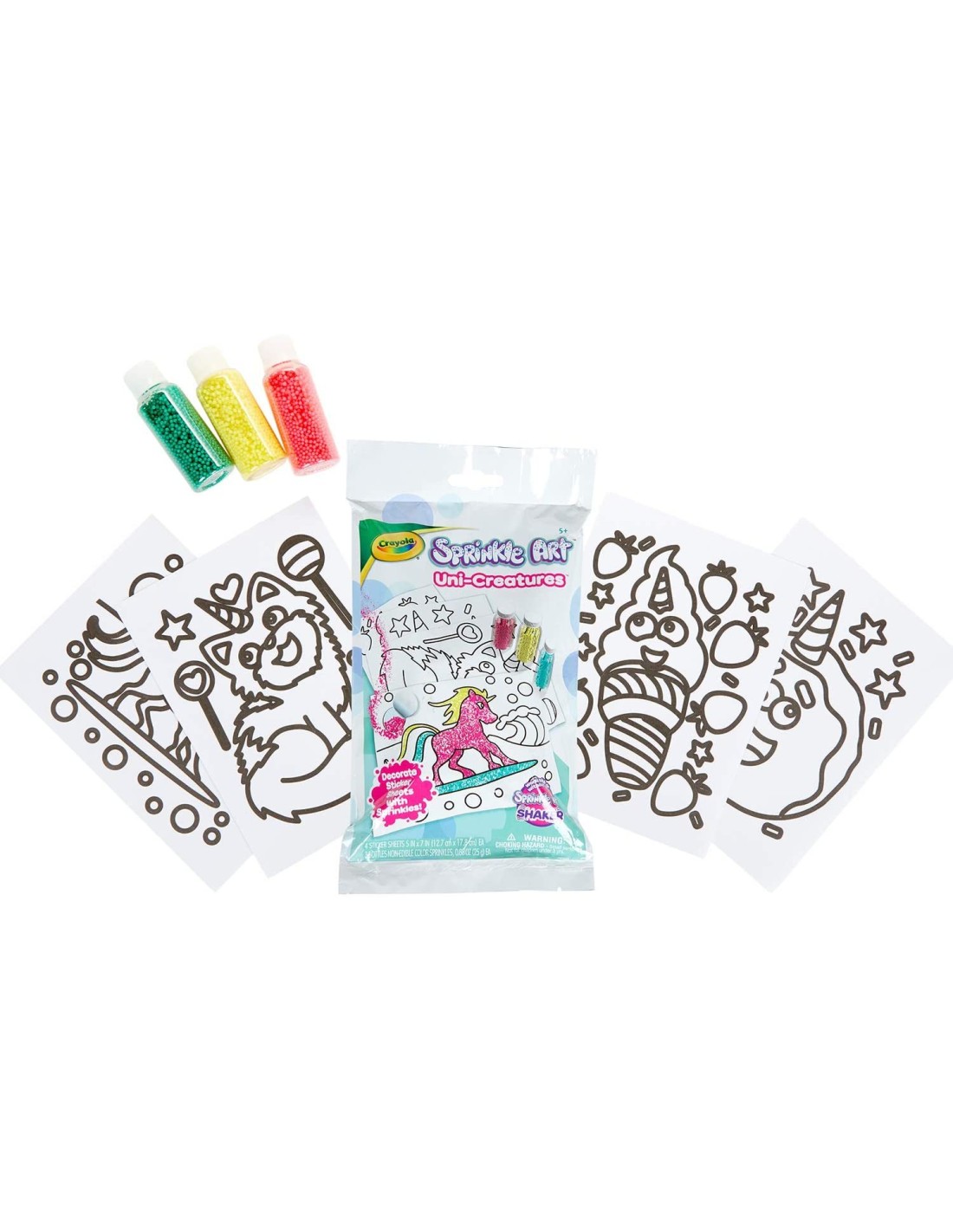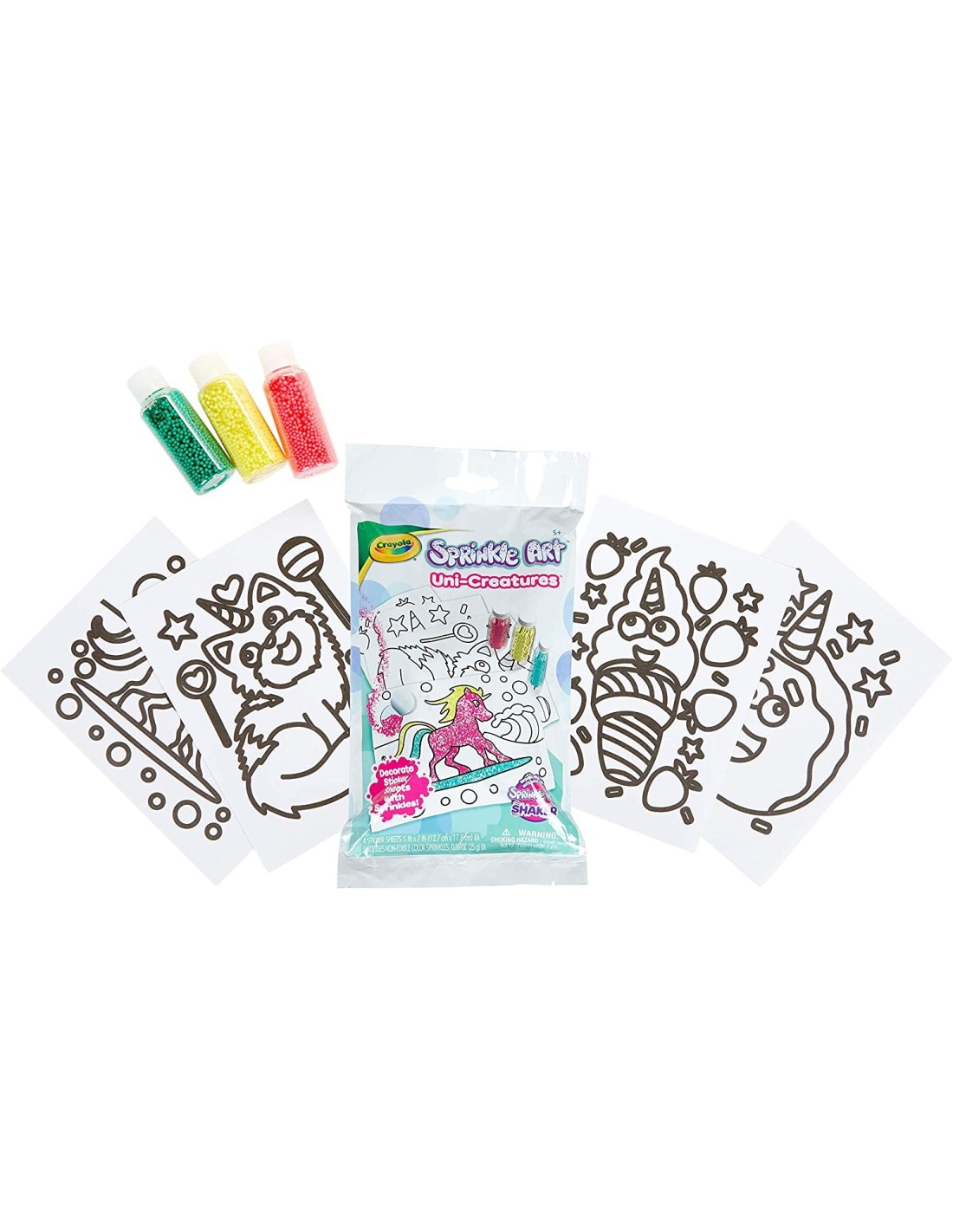 Il set contiene: 4 fogli di adesivi, 3 boccette di perline colorate.