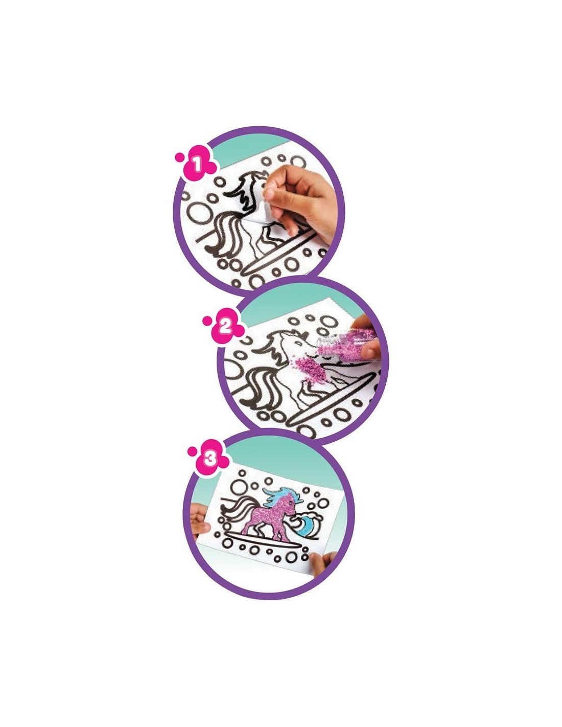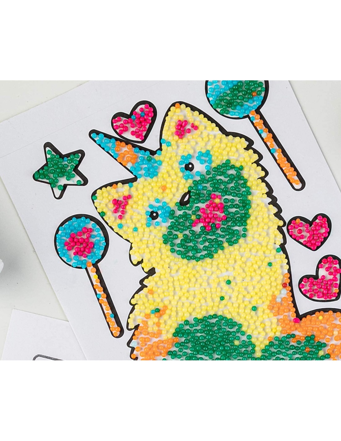 Basta togliere la pellicola dall'adesivo, scegliere le perline del colore desiderato e spargerli nelle aree che si vogliono colorare. Il risultato sarà un effetto a rilievo super originale.