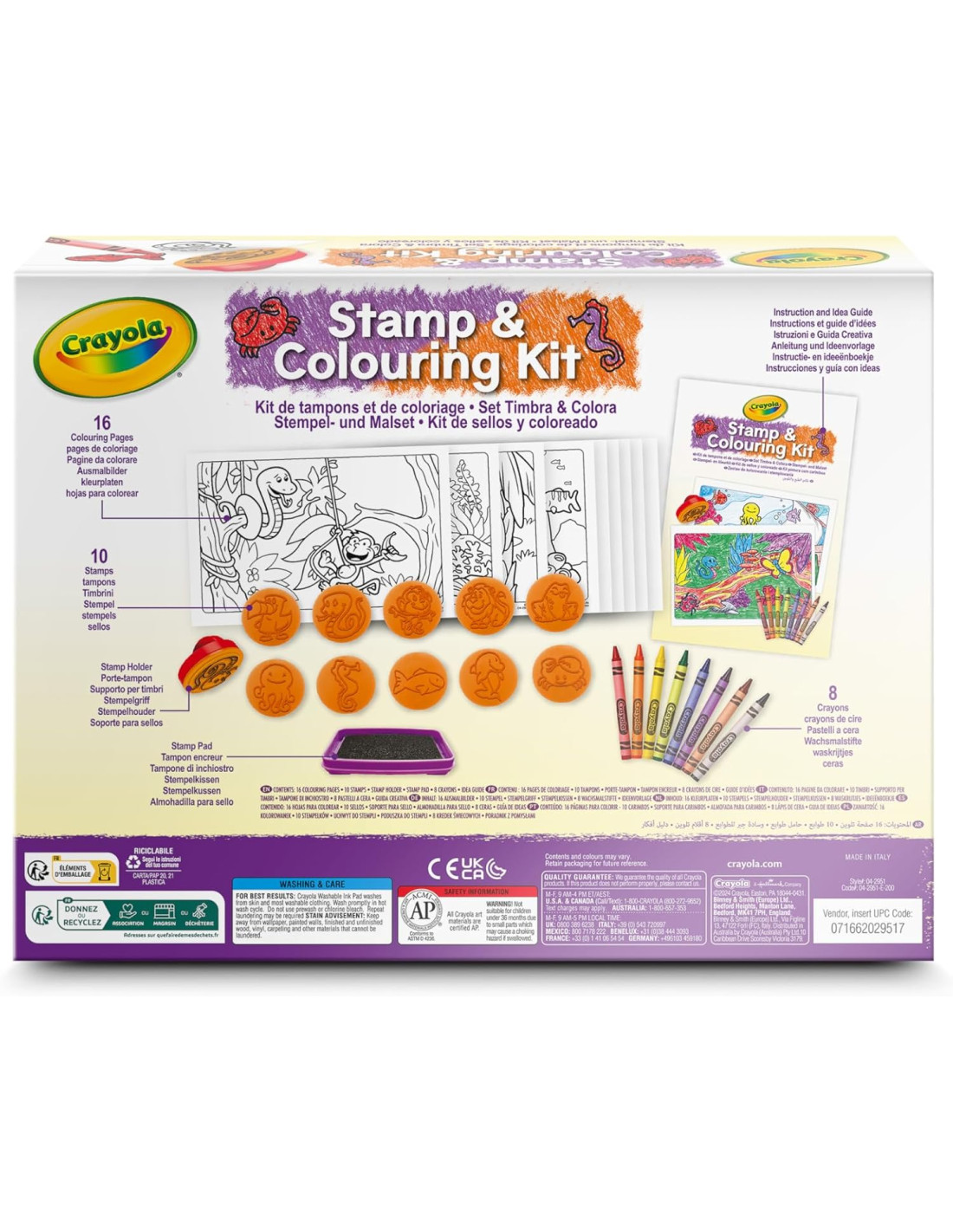 SET COLORING COMPLETO che include 16 Pagine da colorare, 10 Stampini, Tampone di inchiostro, 8 Pastelli a Cera, guida creativa per cominciare subito a creare e personalizzare le scenette incluse con i timbrini di simpatici animaletti