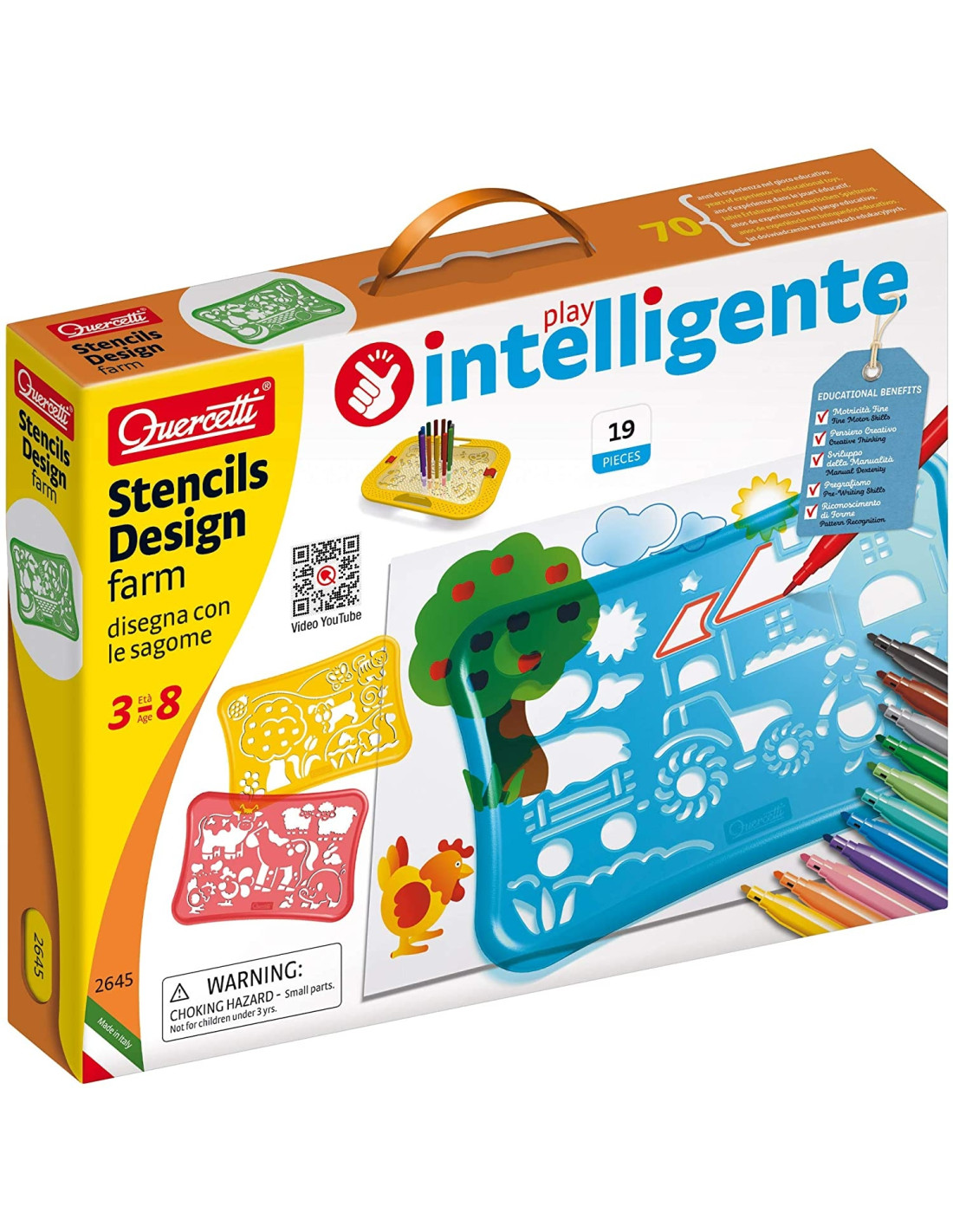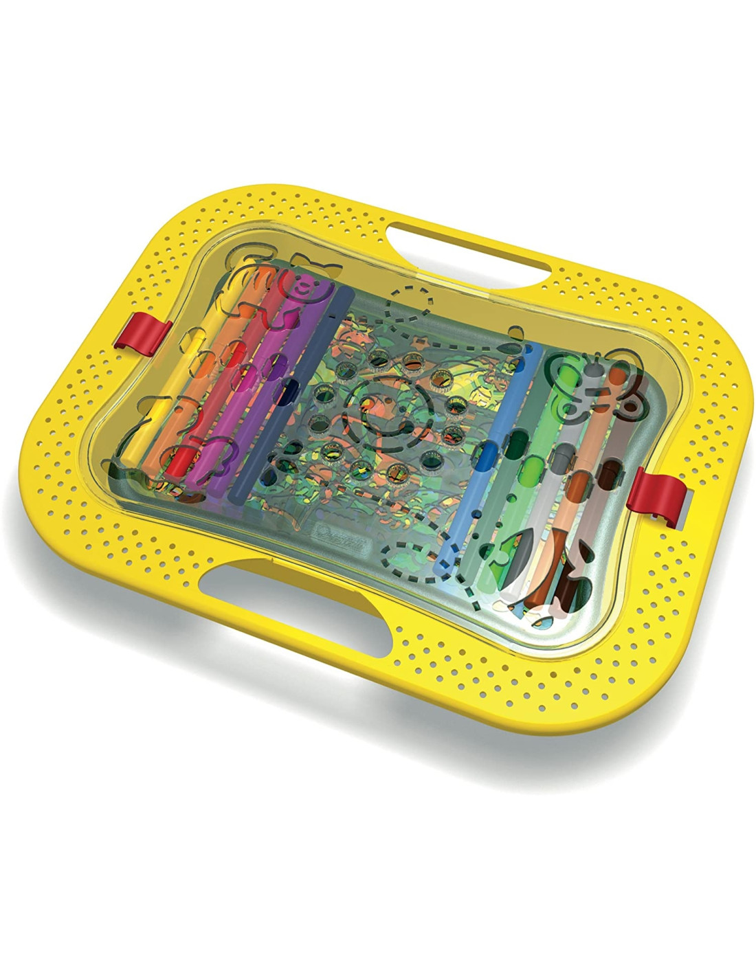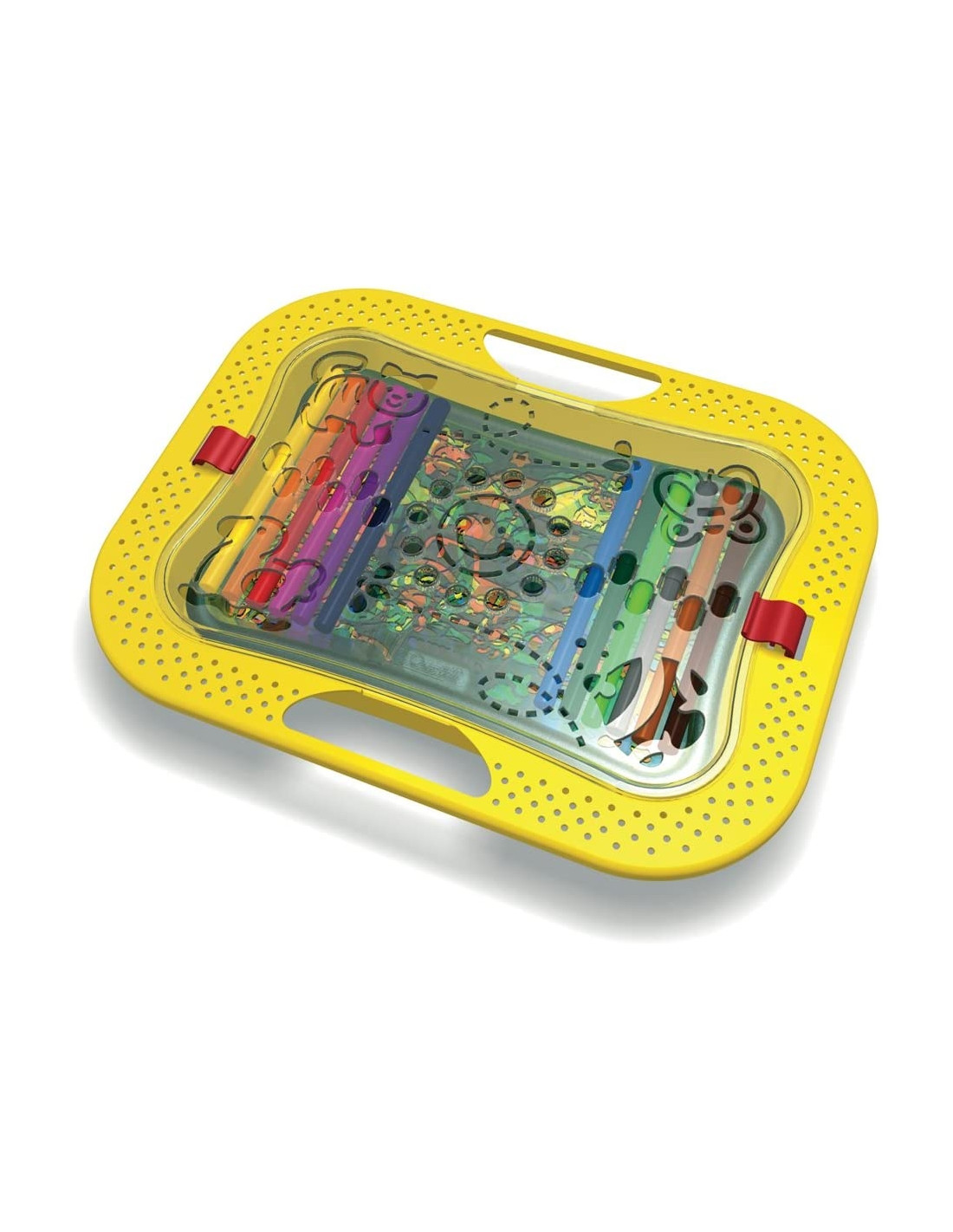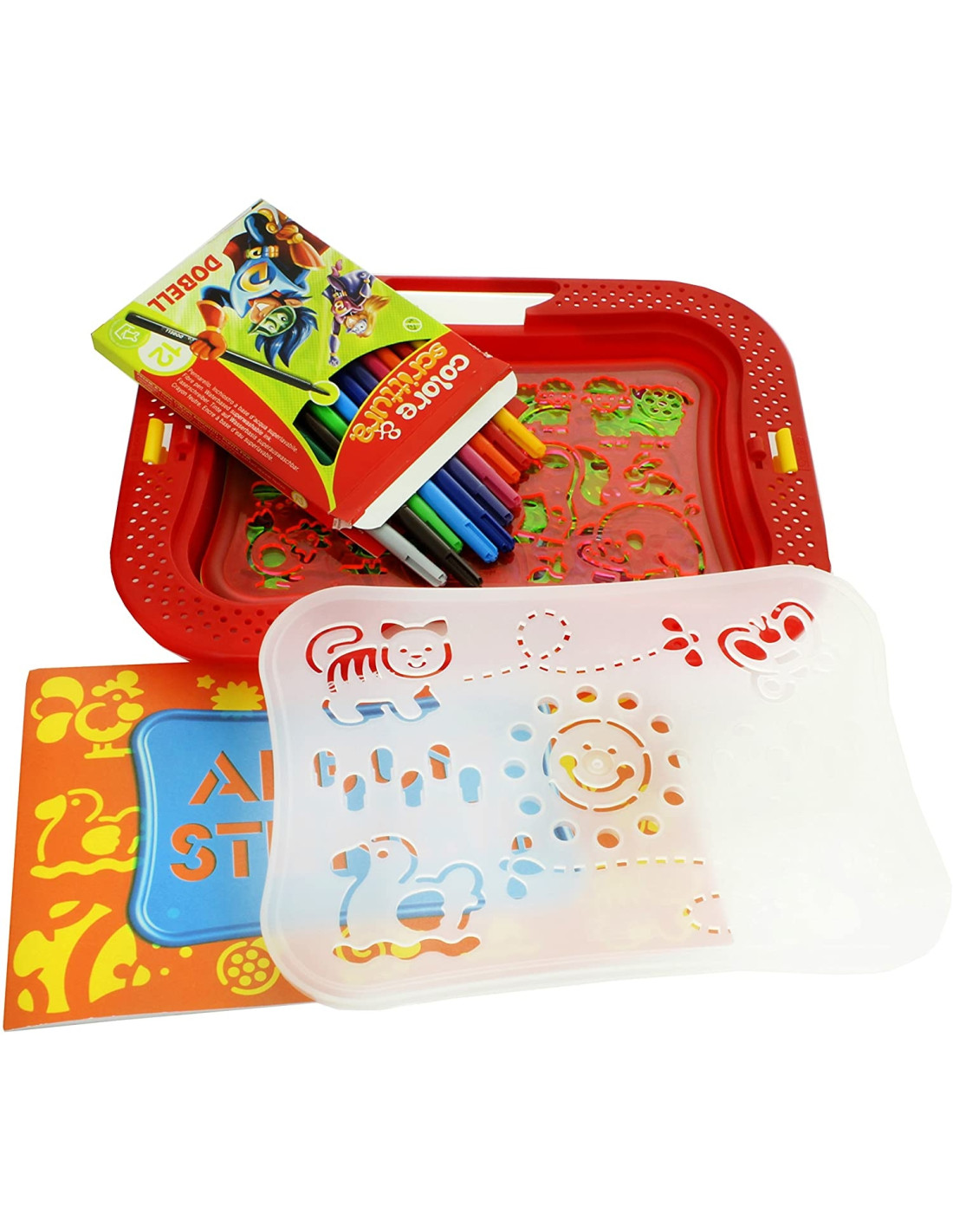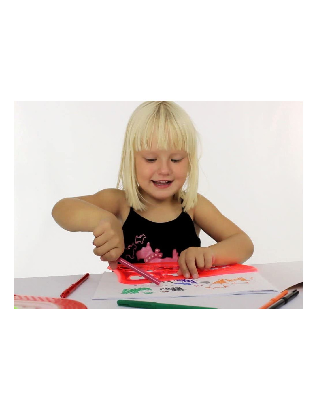 La confezione contiene stencils.che permettono di realizzare disegni precisi e senza sbavature, grazie al bordo rialzato intorno al perimetro esterno Il cestino segue la forma delle sagome e le contiene comodamente insieme ai pennarelli