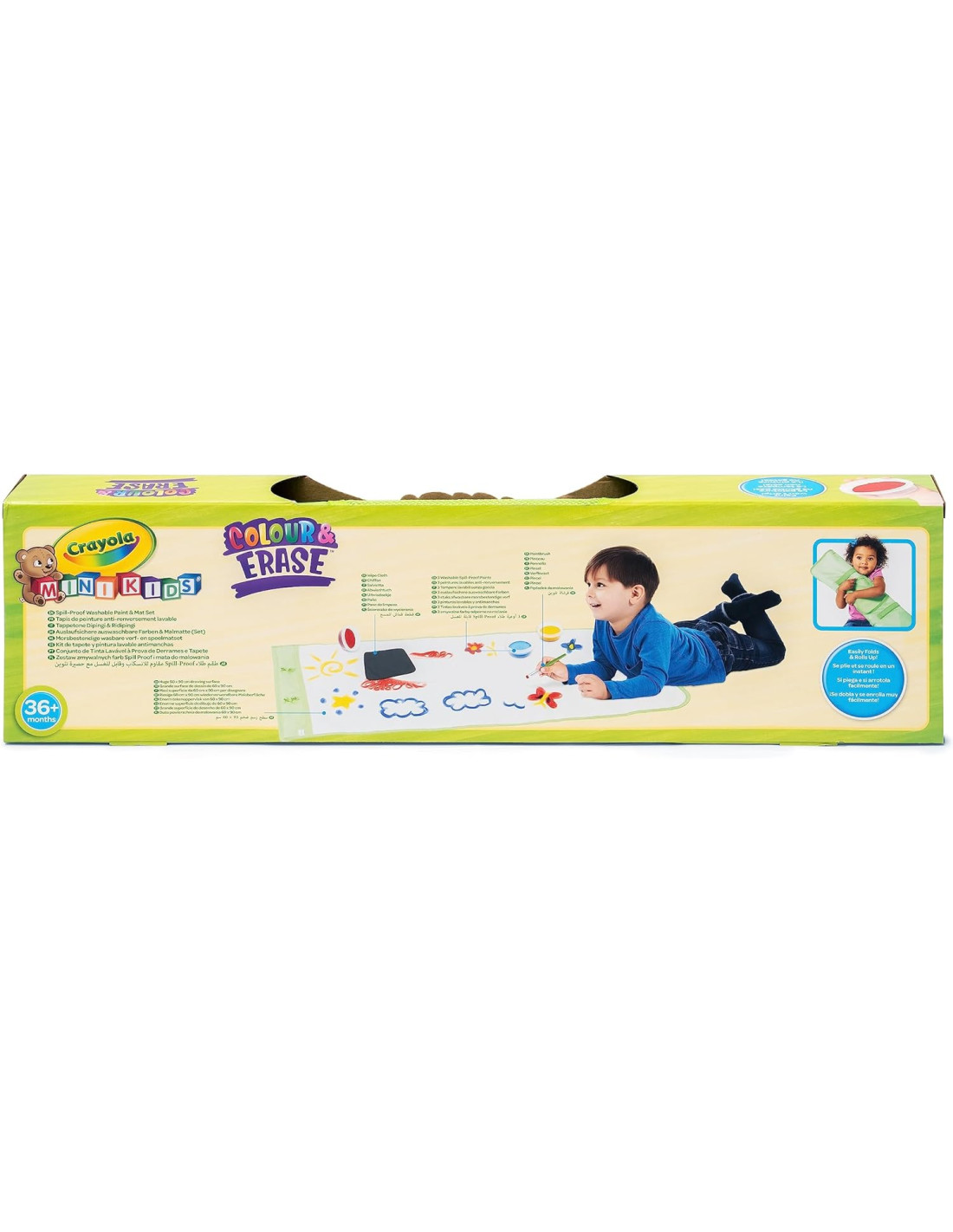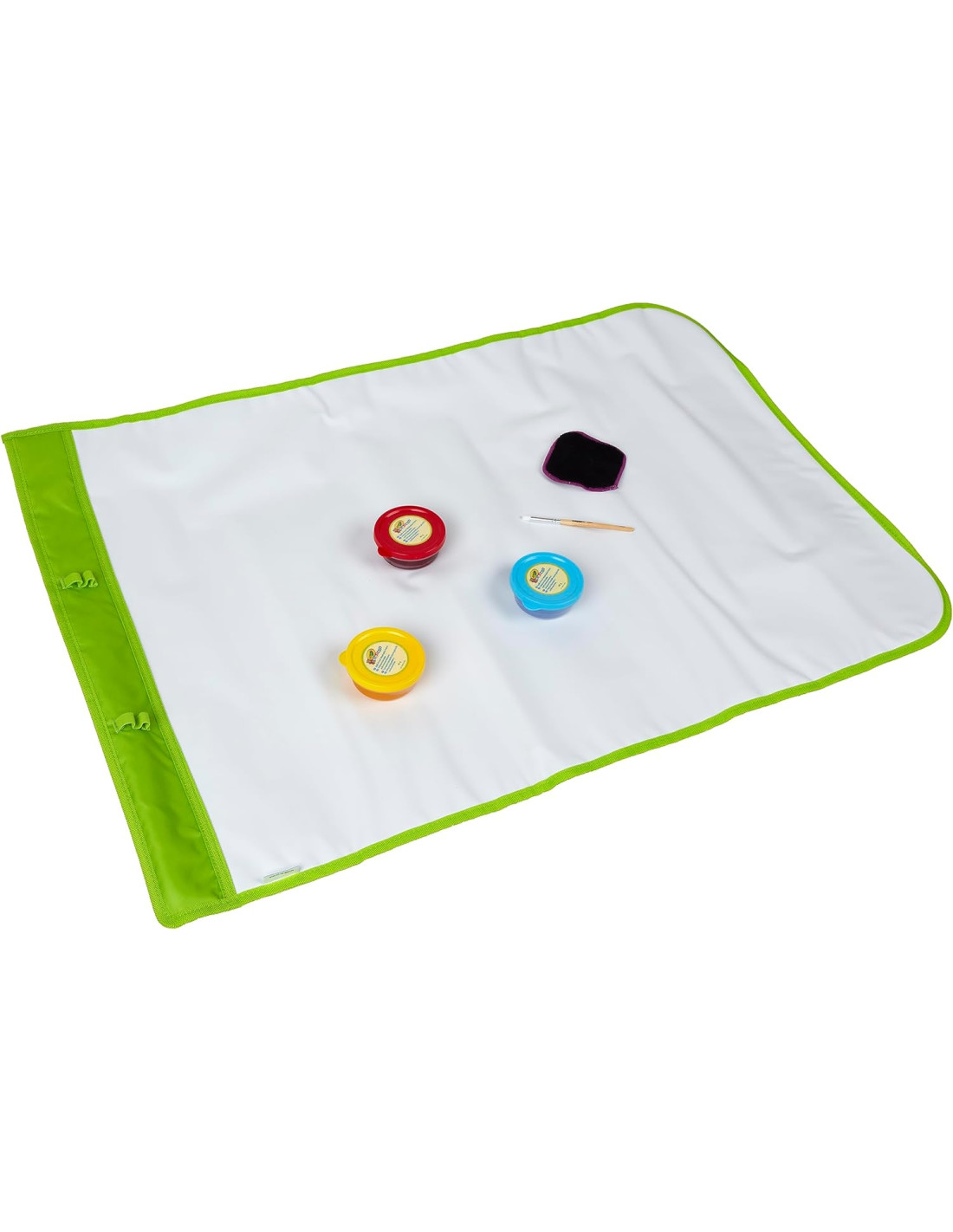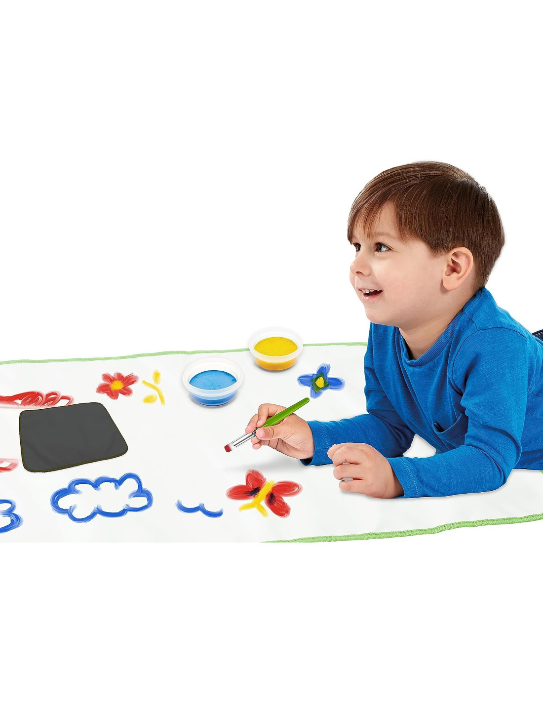 INFORMAZIONI UTILI: Il tappetone Pittura e ripittura è fornito di 3 barattolini di tempere senza goccia, 1 pennello e 1 panno per cancellare. Completo di tasche e asole, è facile da arrotolare per tenere tutto riposto e a portata di mano