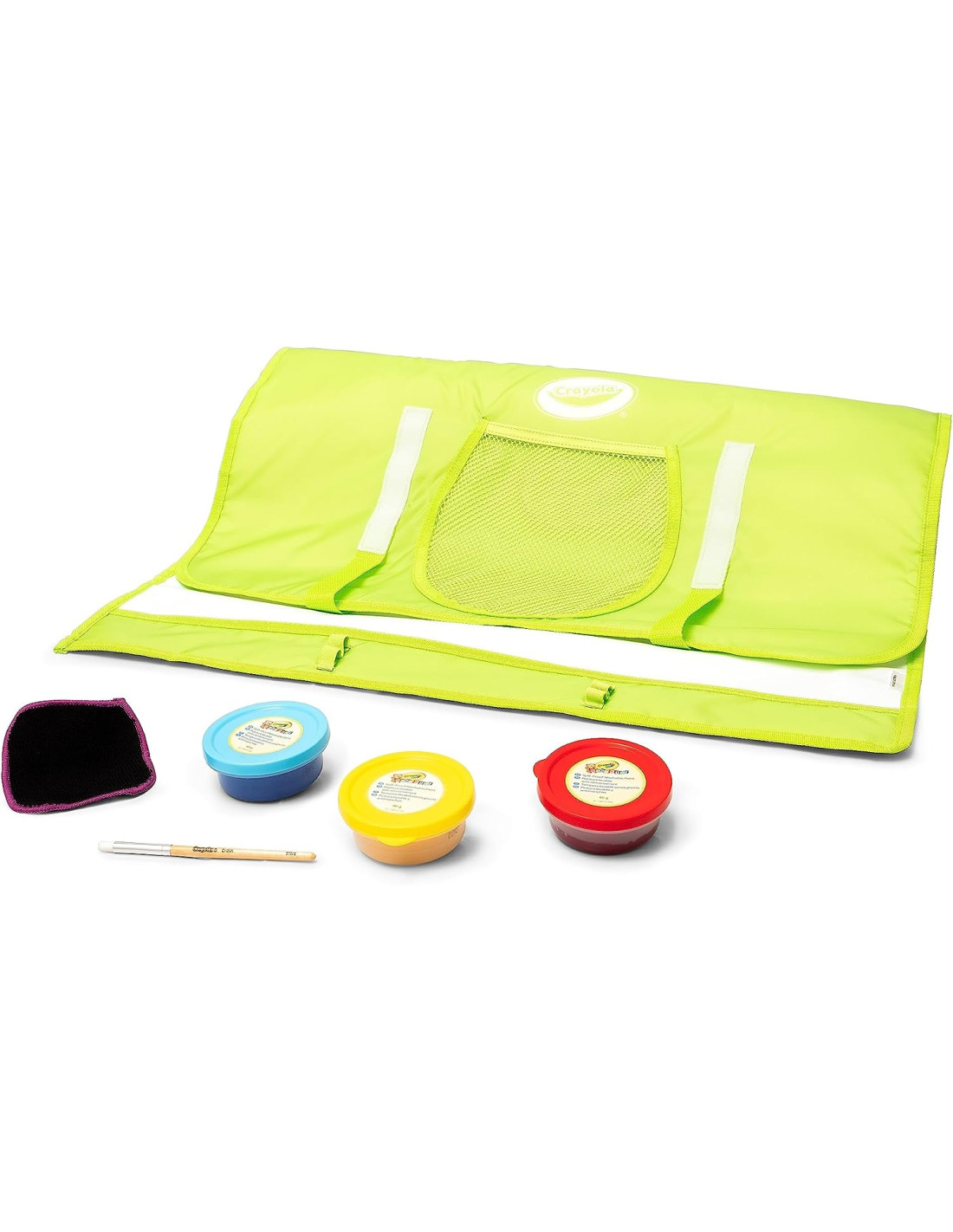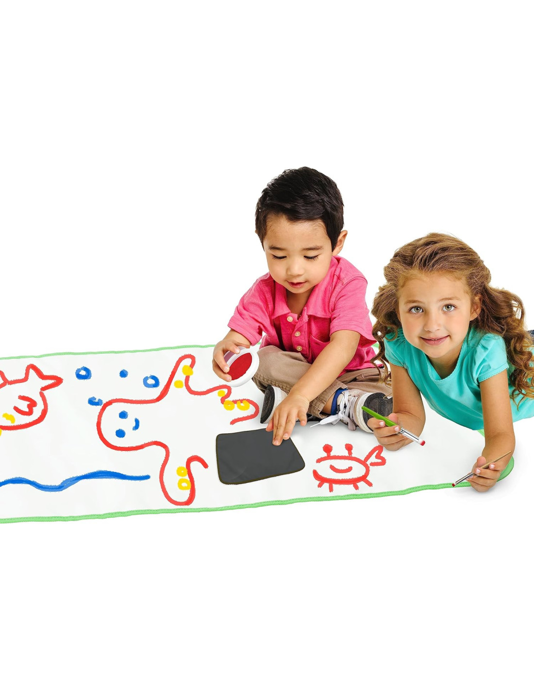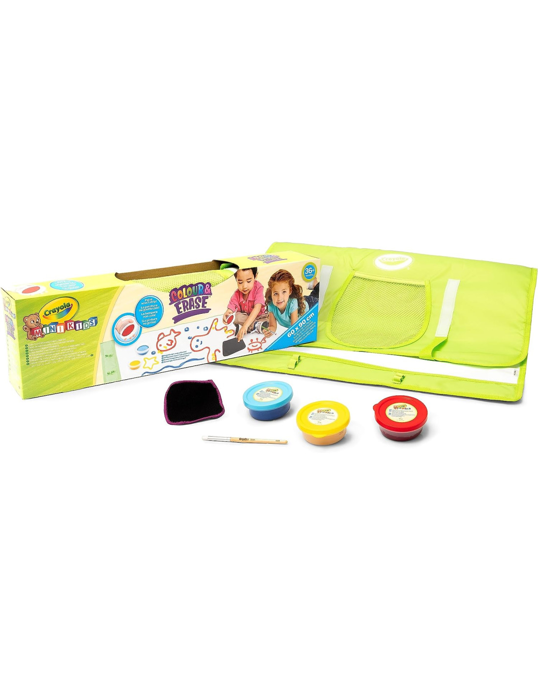 INFORMAZIONI UTILI: Il tappetone Pittura e ripittura è fornito di 3 barattolini di tempere senza goccia, 1 pennello e 1 panno per cancellare. Completo di tasche e asole, è facile da arrotolare per tenere tutto riposto e a portata di mano