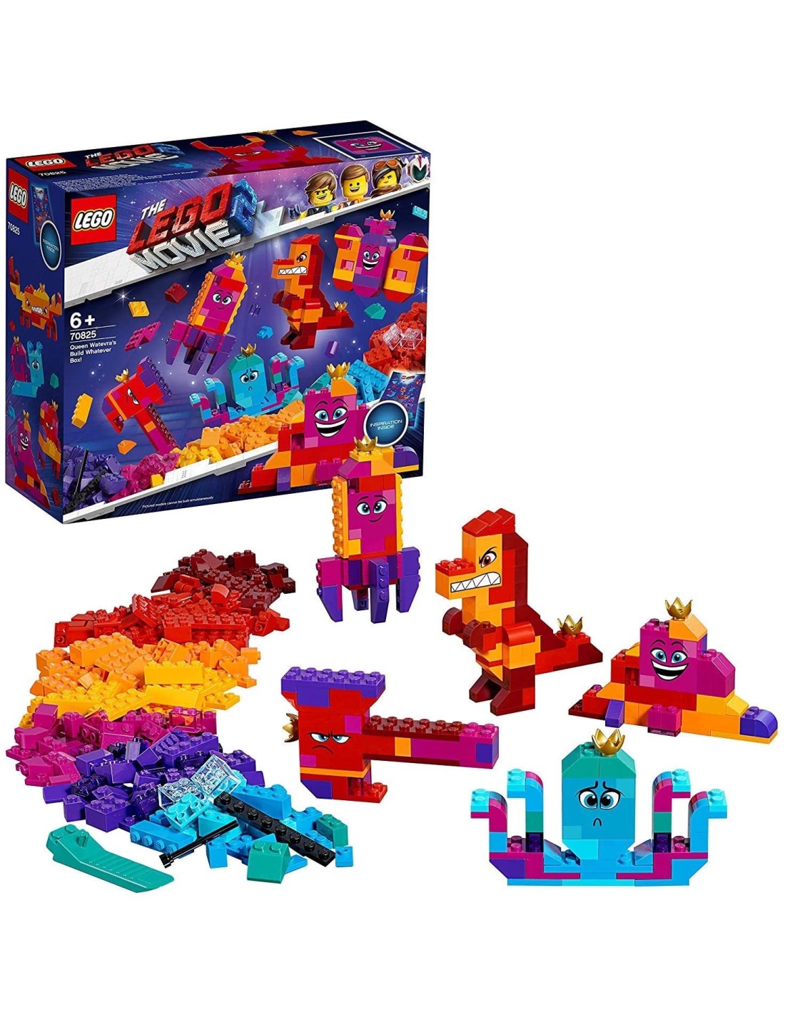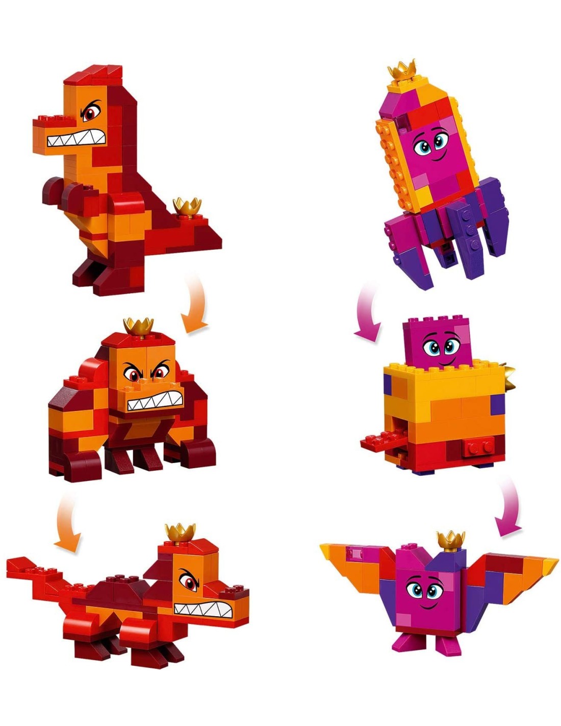 Contiene mattoncini LEGO multicolori per costruire e ricostruire il personaggio di LEGO MOVIE 2 la Regina Wello Ke Wuoglio in 15 forme diverse: pila di mattoncini/Regina; auto; farfalla, martello; diavolo; vulcano; violoncello; balena; polpo; gorilla; dinosauro;drago; pipistrello; razzo e un tostapane.