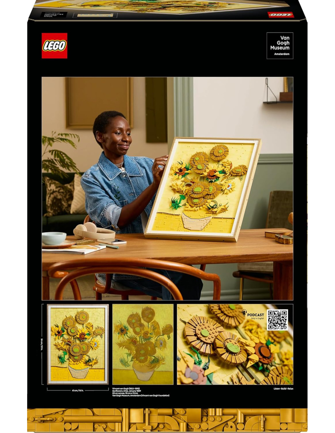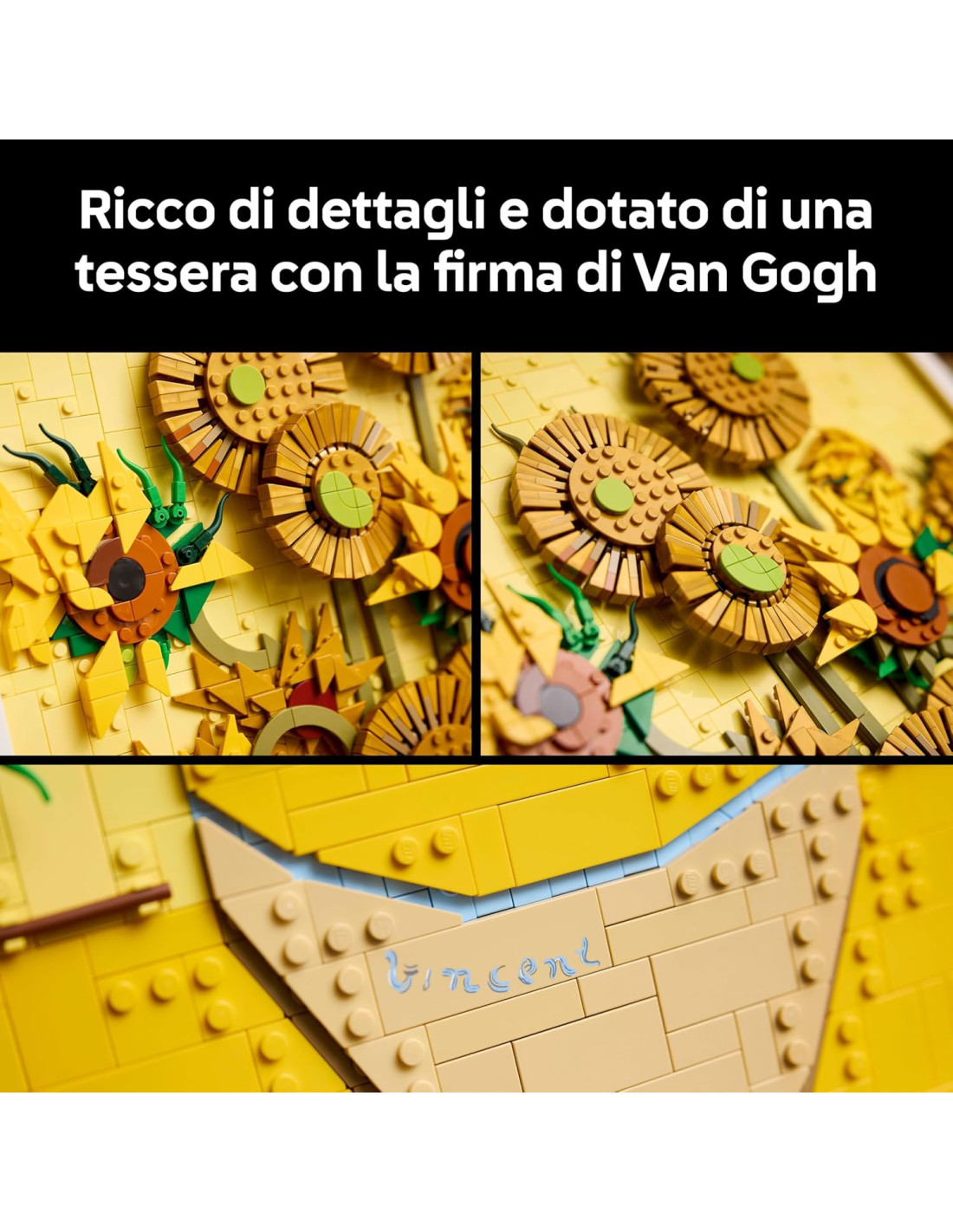 Esplora il genio di Van Gogh e i suoi gloriosi colori con le tre tonalità di giallo del dipinto, e il suo famoso uso di luci e ombre. Questo set da collezione LEGO di 2.615 pezzi contiene 16 girasoli con petali regolabili, una cornice rimovibile, una tessera con la firma di Van Gogh e un elemento “gancio” per esporlo al muro. Un colorato regalo creativo per una donna o per un uomo, pensato per decorare la casa degli adulti e degli amanti dell'arte.