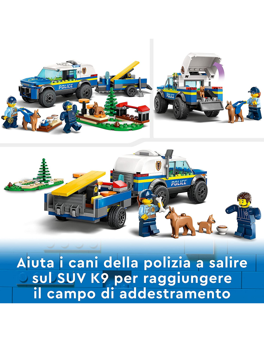 Addestramento cinofilo mobile LEGO City (60369). Ricco di ispirazione per il gioco di fantasia, il set è dotato di un SUV K9, un rimorchio e 3 attività per l'addestramento dei cani, tra cui un'altalena, una barra per il salto e pedane. Basta aggiungere i poliziotti, il cane e il cucciolo per iniziare il divertimento.