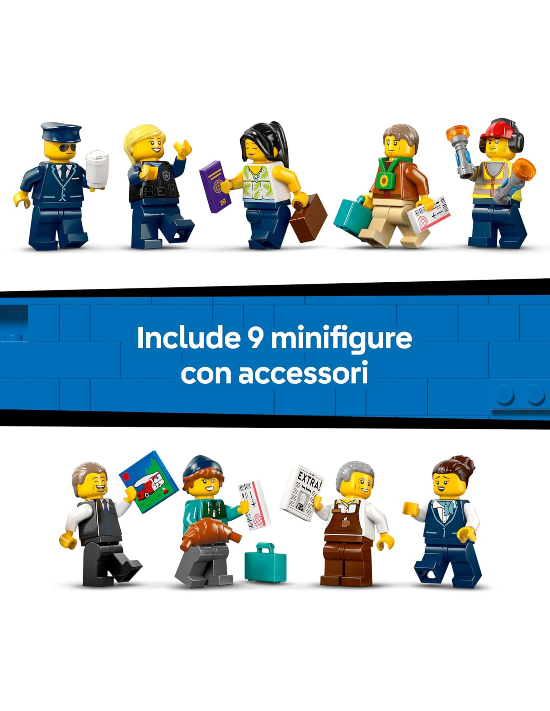 AVVENTURE IN VIAGGIO: include un aeroporto LEGO, un aereo passeggeri, un ponte d'imbarco mobile e un trattore aeroportuale, oltre a 9 minifigure per i giochi creativi con la fantasia