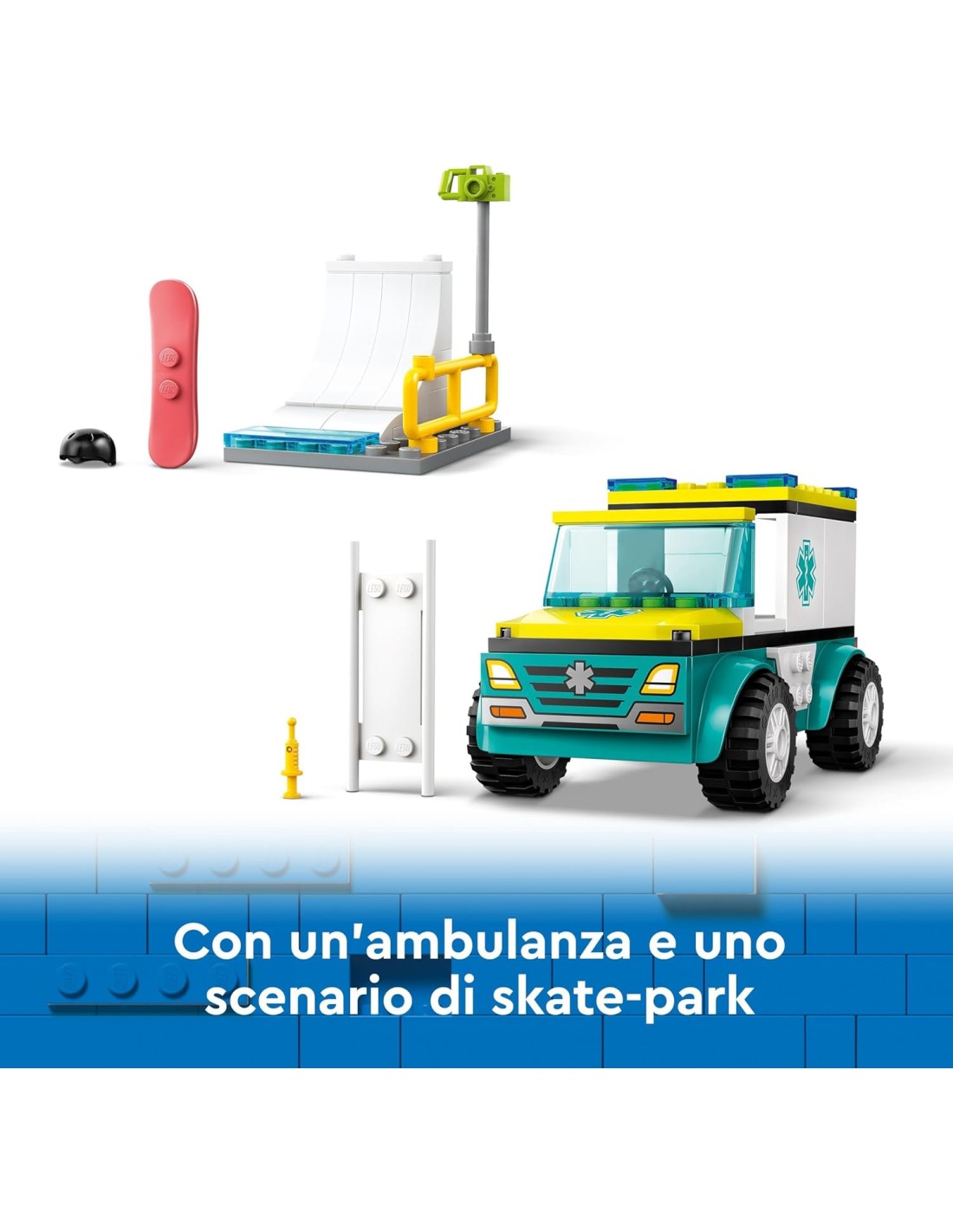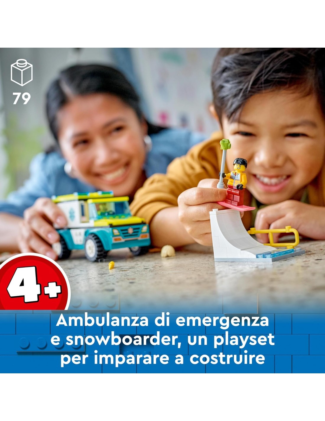 LEGO City Ambulanza di Emergenza e Snowboarder, Veicolo Giocattolo Fuoristrada per il Pronto Soccorso, Giochi per Bambini Bambine da 4 Anni in su con Minifigure del Paramedico.