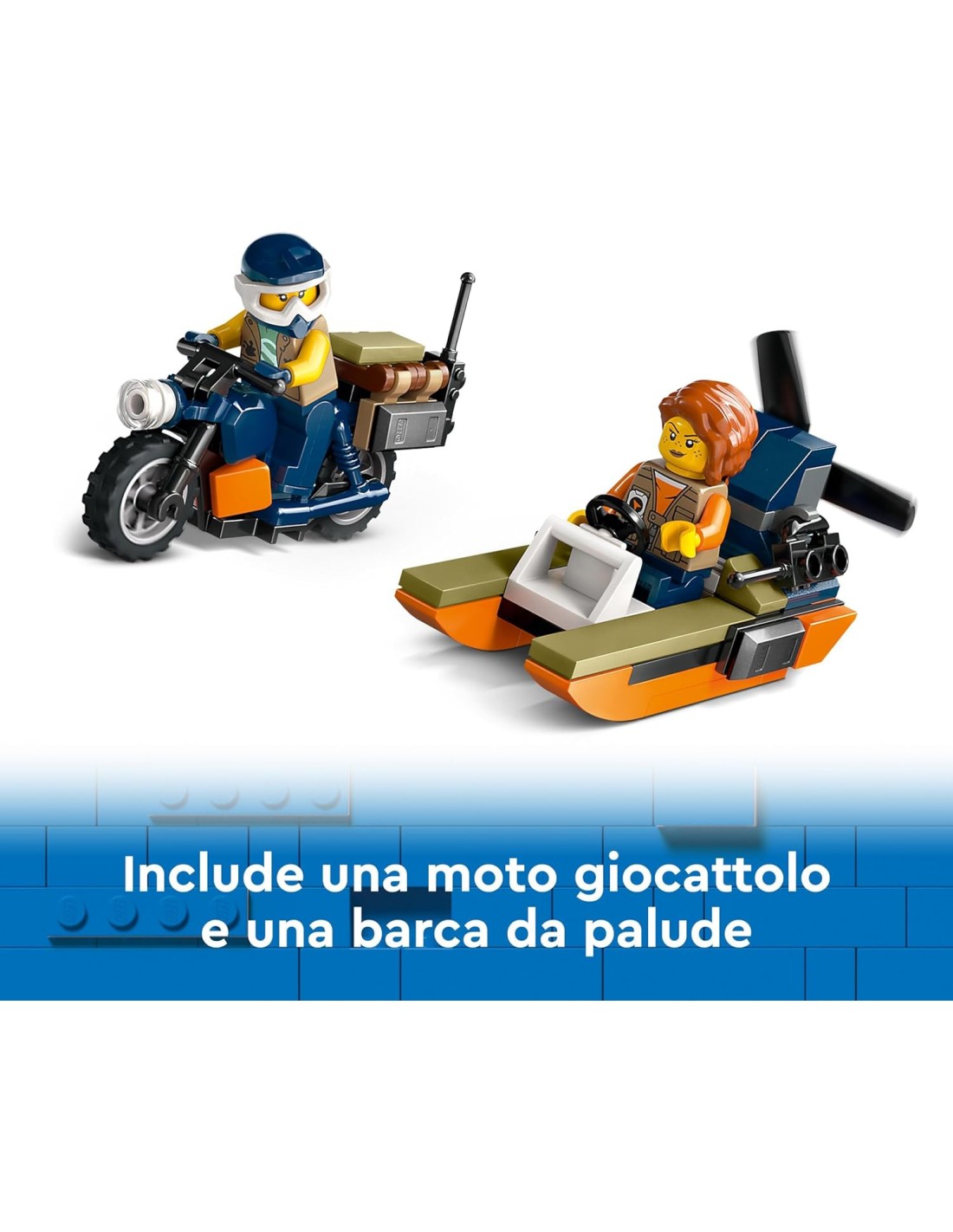 Regala al tuo piccolo esploratore il set di gioco d'avventura Elicottero dell'Esploratore nella giungla LEGO City (60437), per i bambini dagli 8 anni in su, contenente un realistico elicottero giocattolo con doppi rotori sincronizzati, 2 vani di carico e un verricello funzionante. Il set include anche una motocicletta, una barca da palude e un campo base nella giungla, più 5 minifigure di avventurieri e 3 gorilla, tra cui un cucciolo di gorilla, per il gioco di fantasia e la narrazione di storie. Questo giocattolo costruibile della giungla LEGO City include una dettagliata guida alla costruzione stampata e istruzioni 3D nell'app LEGO Builder, un assistente nella costruzione digitale con strumenti intuitivi di ingrandimento e rotazione che consentono ai bambini di visualizzare i modelli da tutte le angolazioni mentre lo costruiscono. I set LEGO City sono fantastici regali di Natale e di compleanno per i bambini, con meravigliosi veicoli, strutture realistiche e personaggi divertenti che ispirano il gioco di fantasia senza limiti. I bambini possono aggiungere questo set giocattolo con animali della giungla LEGO City ad altri set di gioco (disponibili separatamente) della gamma LEGO City per espandere il mondo delle possibilità di gioco.