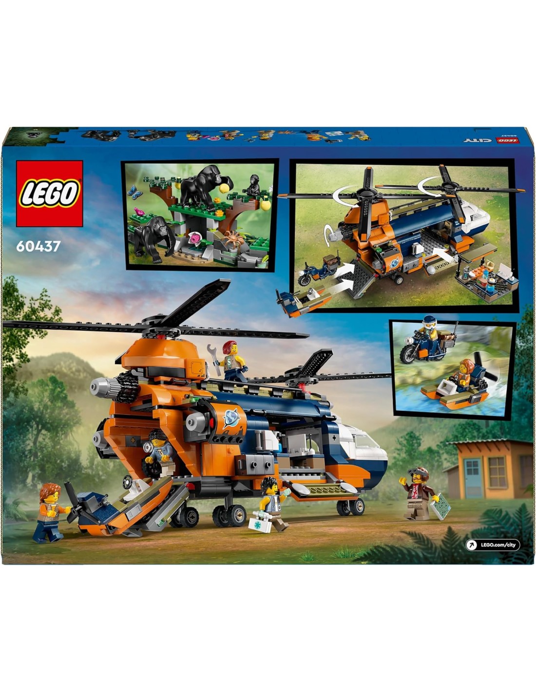 Playset d'avventura nella giungla LEGO City con un elicottero a doppio rotore, campo base e ambientazioni nella giungla, 5 minifigure e 3 gorilla.