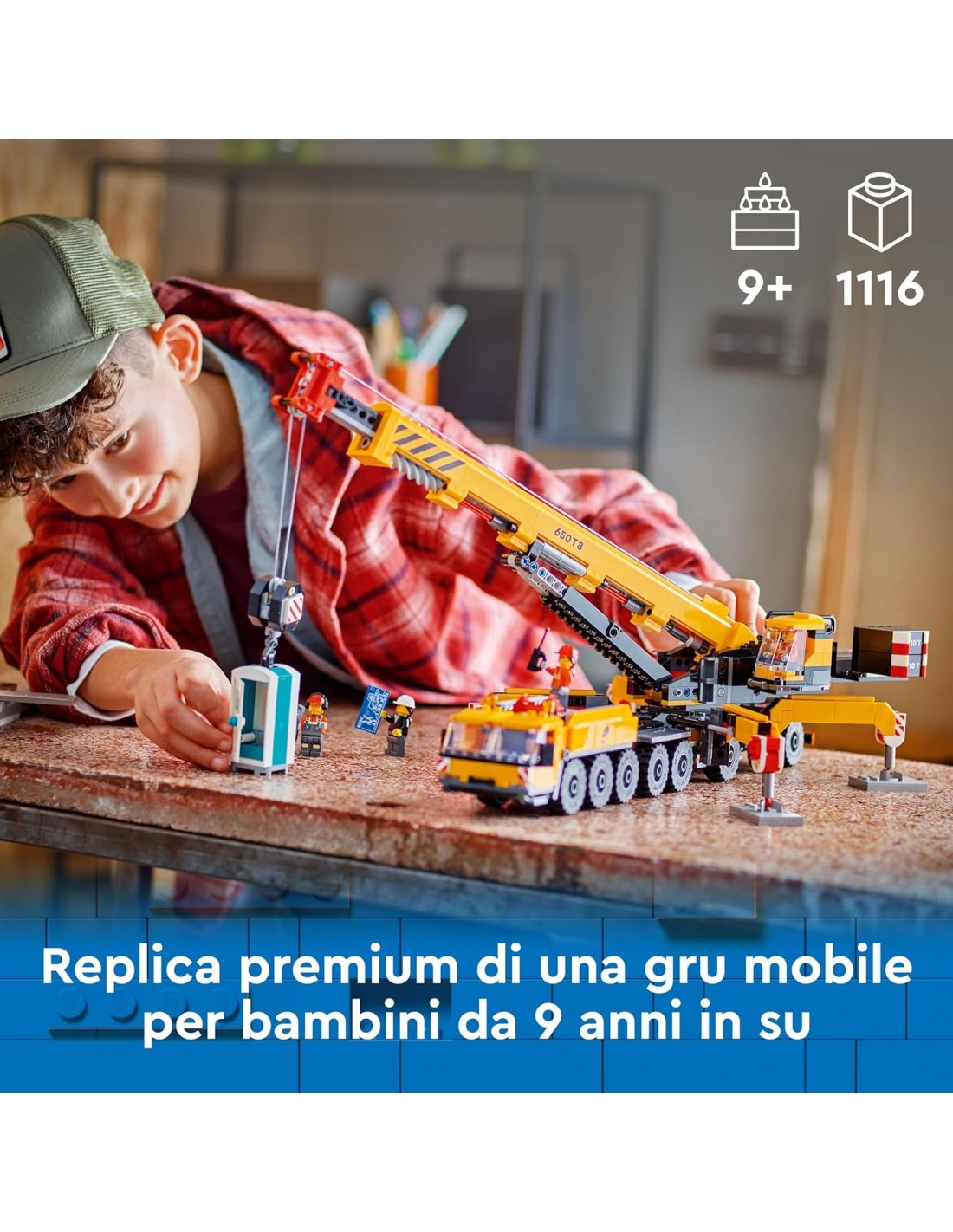 Accendi la passione dei bambini per i fantastici veicoli da cantiere con questo giocattolo della Gru da cantiere mobile gialla LEGO City (60409) per bambini dai 9 anni in su. Questo impressionante modello è dotato di molte funzioni realistiche. I bambini possono aprire le gambe di supporto, ruotare la cabina, estendere e ruotare il braccio di 360° e azionare l'argano. Basta aggiungere le 4 minifigure degli operai per il gioco di ruolo di fantasia e la narrazione di storie. Questo veicolo da cantiere LEGO include una guida alla costruzione stampata e istruzioni 3D nell'app LEGO Builder, un assistente alla costruzione digitale con strumenti intuitivi di ingrandimento e rotazione che consentono ai bambini di visualizzare il modello da tutte le angolazioni mentre lo costruiscono. I set LEGO City sono un regalo creativo per i bambini, con fantastici veicoli, strutture realistiche e personaggi divertenti che ispirano senza limiti. I bambini possono aggiungere questo set della gru LEGO City ad altri set di gioco (disponibili separatamente) della gamma LEGO City per espandere il mondo delle possibilità di gioco.
