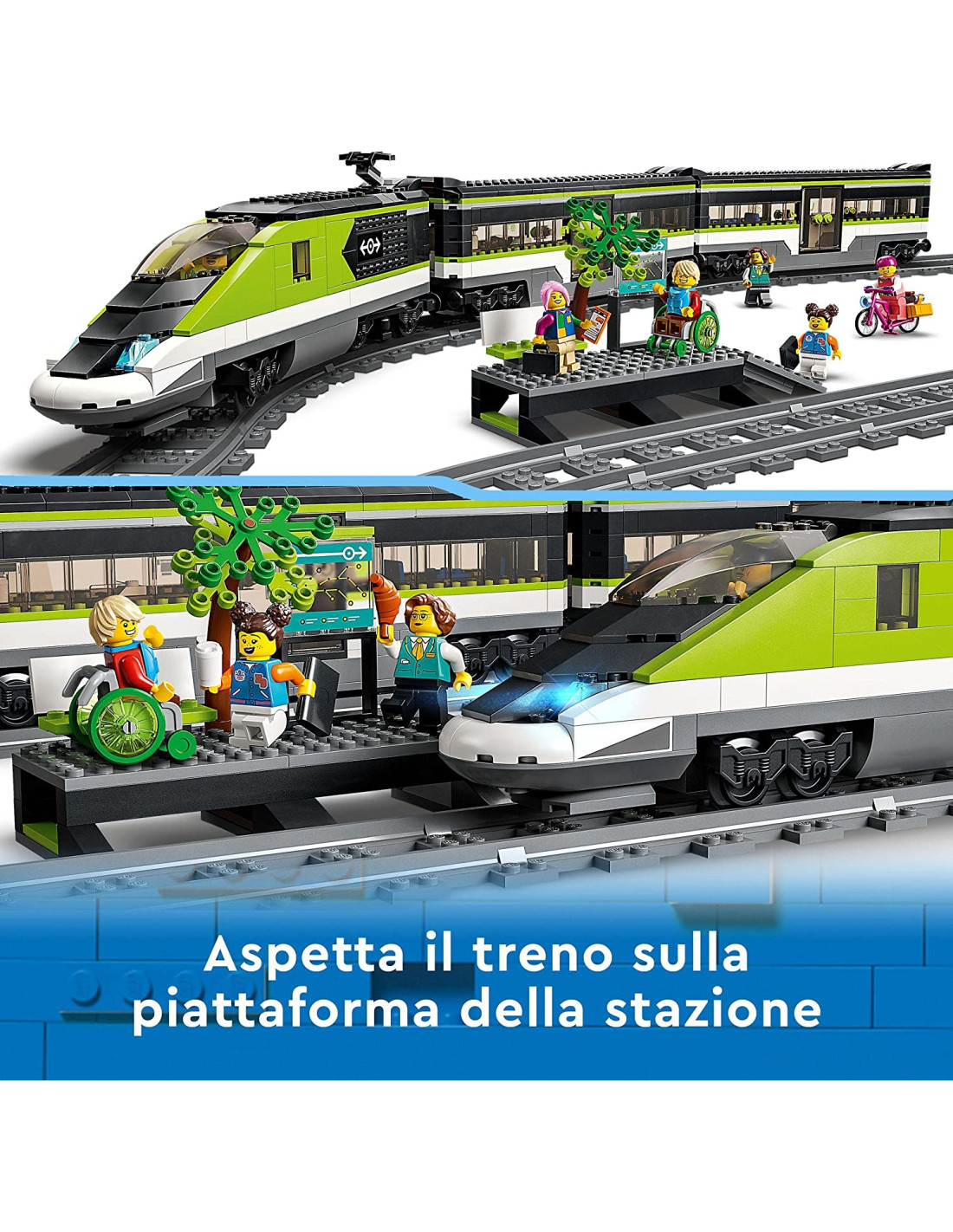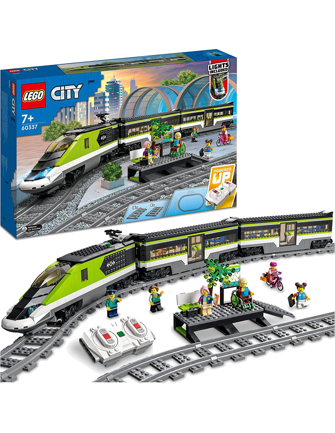 Il set LEGO City Treno passeggeri espresso (60337) include una locomotiva ad alta velocità telecomandata con fari dimmerabili funzionanti e tecnologia LEGO Powered Up, un vagone ristorante, una carrozza per i passeggeri, una banchina della stazione, 24 pezzi di binari e 6 minifigure per infinite ore di gioco a tema ferroviario.