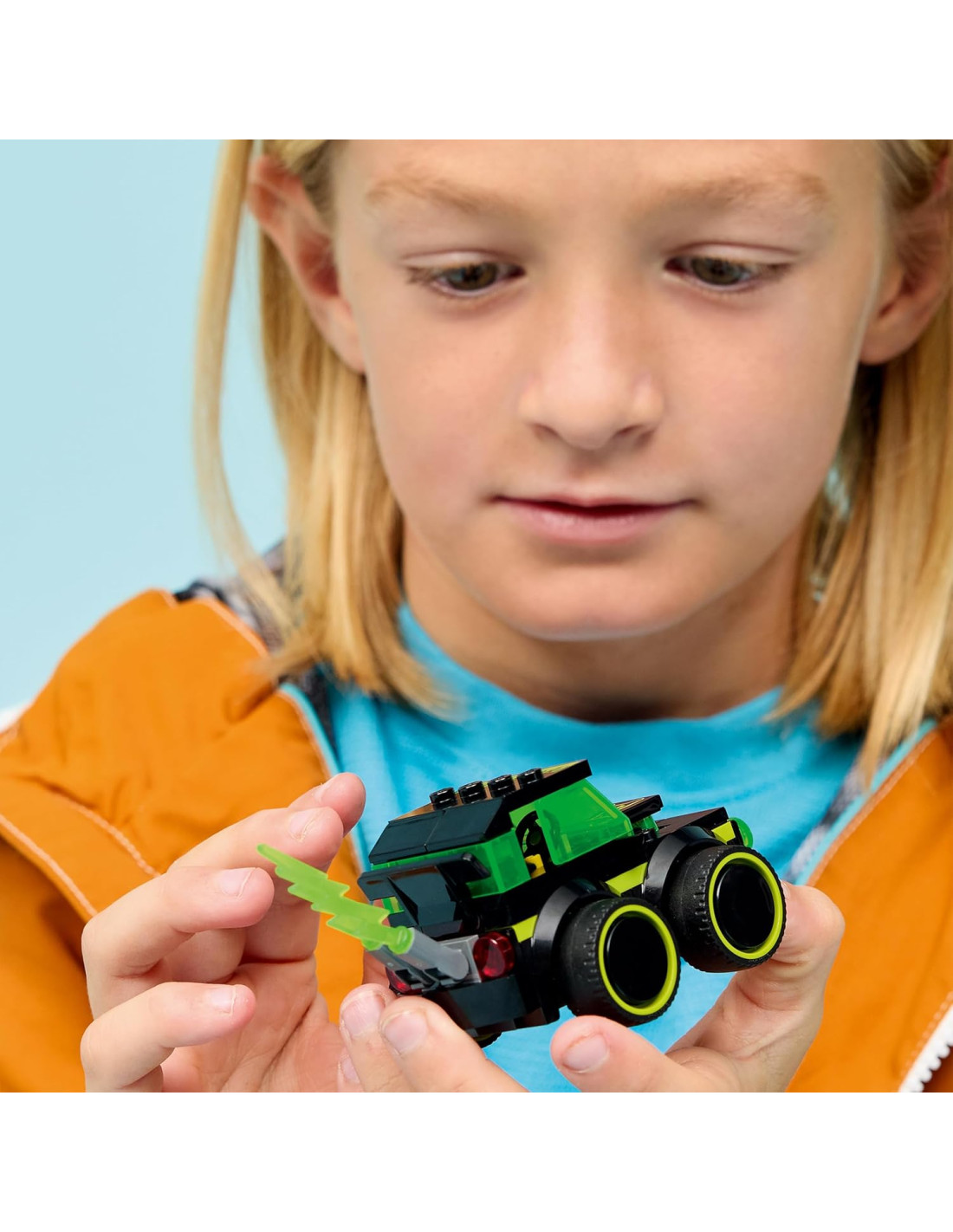 RAFFORZARE LA FIDUCIA IN SÉ STESSI: i piccoli migliorano la motricità fine costruendo questo modello di auto, caratterizzato da un design neon, pneumatici in gomma sovradimensionati, cabina di guida e tubo di scarico fiammeggiante