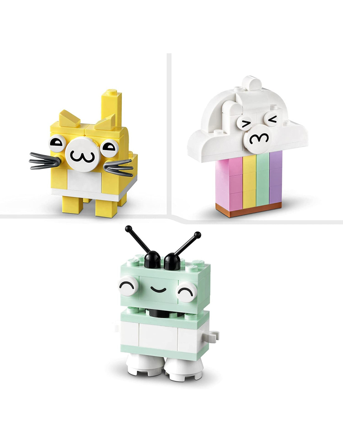 Questo gioco creativo consente di realizzare i propri progetti o di utilizzare le istruzioni per costruire i modellini di una nuvola, un gelato, un gatto, un dinosauro e un robot giocattolo Include 333 mattoncini LEGO di diverse dimensioni in 6 colori pastello, 18 dei quali sono dotati di occhi espressivi, che i bambini possono usare per dare vita alle loro creazioni