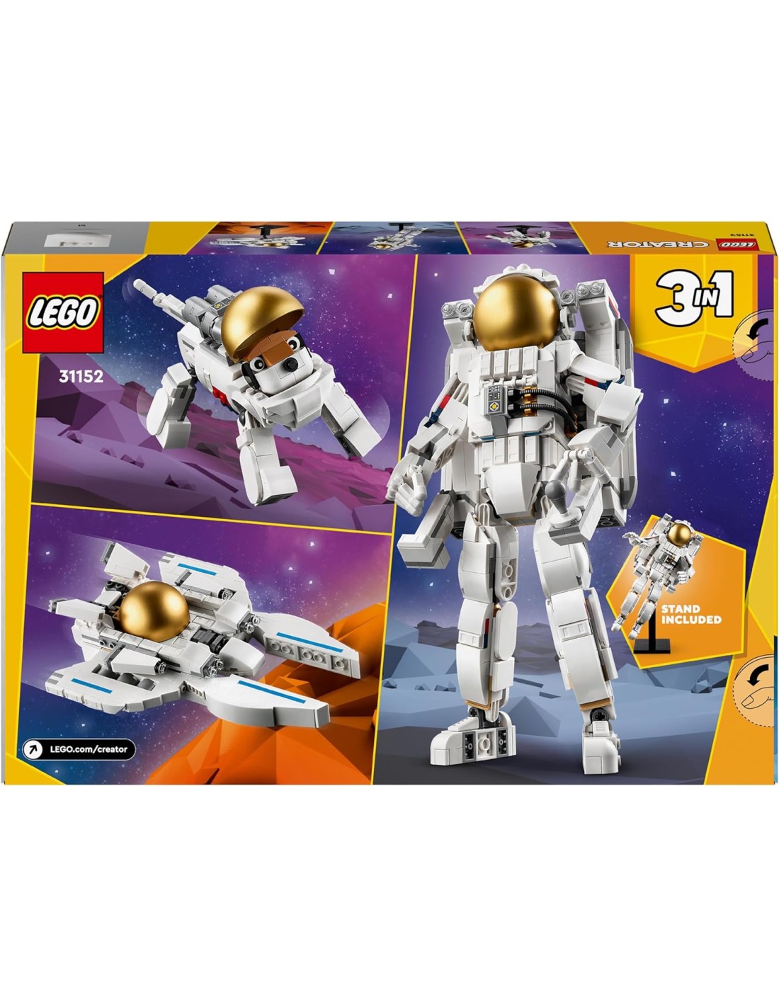 Offri ai fan delle missioni spaziali il set LEGO Creator 3 in 1 Astronauta (31152), un gioco da costruire per bambini e bambine da 9 anni in su, con cui esplorare nuovi pianeti e vivere divertenti avventure nello spazio. La figura dell'astronauta LEGO è dotata di uno zaino staccabile a propulsione, di gambe, piedi, braccia e dita snodabili, e di una visiera dorata apribile, con un posto all'interno per una minifigure (non inclusa). Questo gioco educativo a tema spazio offre 3 diversi set di modelli spaziali: oltre all'astronauta snodabile, i piccoli possono costruire un modellino di cane spaziale giocattolo futuristico, con gambe e coda snodabili, o un'astronave giocattolo viper jet con sedile per una minifigure pilota (non inclusa). Tutti e 3 i modelli sono dotati di supporto per l'esposizione e sono degli ottimi regali creativi per gli amanti delle costruzioni e dei set a tema spazio LEGO. I set LEGO Creator 3 in 1 permettono ai piccoli esploratori di vivere ore di intrattenimento e di gioco con la fantasia, grazie a una gamma di costruzioni che soddisfa le loro passioni con veicoli superveloci, animali mobili e ambientazioni cittadine dettagliate.
