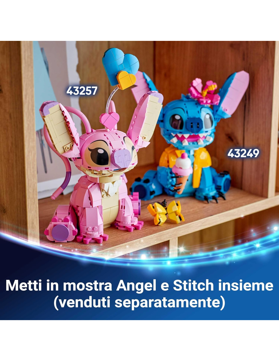 Gadget LEGO Disney play and display: decora Angel con i cuori “fluttuanti” o con la farfalla, muovi la testa e le orecchie in diverse pose ed espressioni, e utilizza questo colorato modello Disney come decorazione di casa o della camera dei piccoli Idea regalo Disney Lilo e Stitch per i fan dello show TV: questo personaggio LEGO ? Disney da costruire, è un'ottima idea regalo di compleanno per bambine e bambini che amano la serie televisiva e vogliono stupire tutti i loro amici a scuola