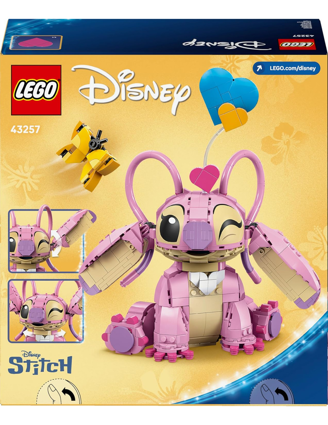 Cosa c'è nella scatola: questo set di giochi Lilo e Stitch in mattoncini LEGO, contiene il personaggio Disney di Angel, una farfalla e 3 palloncini a forma di cuore “fluttuanti”, da costruire e da usare per decorare il modellino