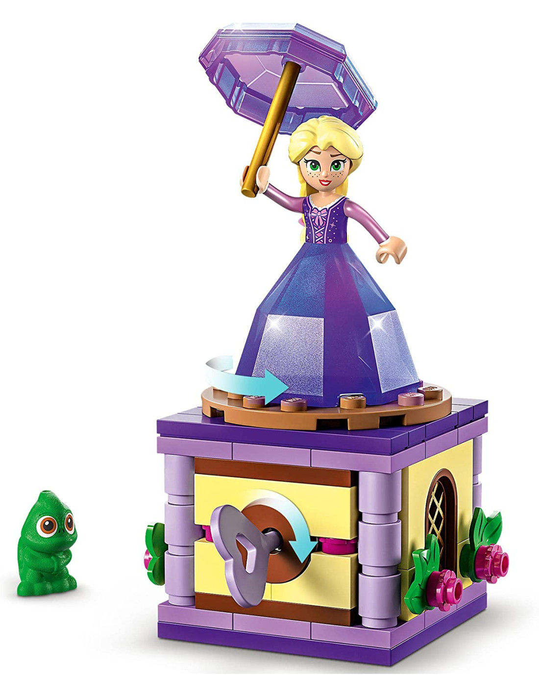 Incanta i bambini dai 5 anni in su con il set Rapunzel rotante LEGO Disney (43214), contenente un supporto costruibile con dettagli decorativi, chiave e spazio per la figura LEGO di Pascal il camaleonte, una mini-doll LEGO di Rapunzel e un vestito “a diamante” che si collega all'ombrello per riporre la mini-doll.