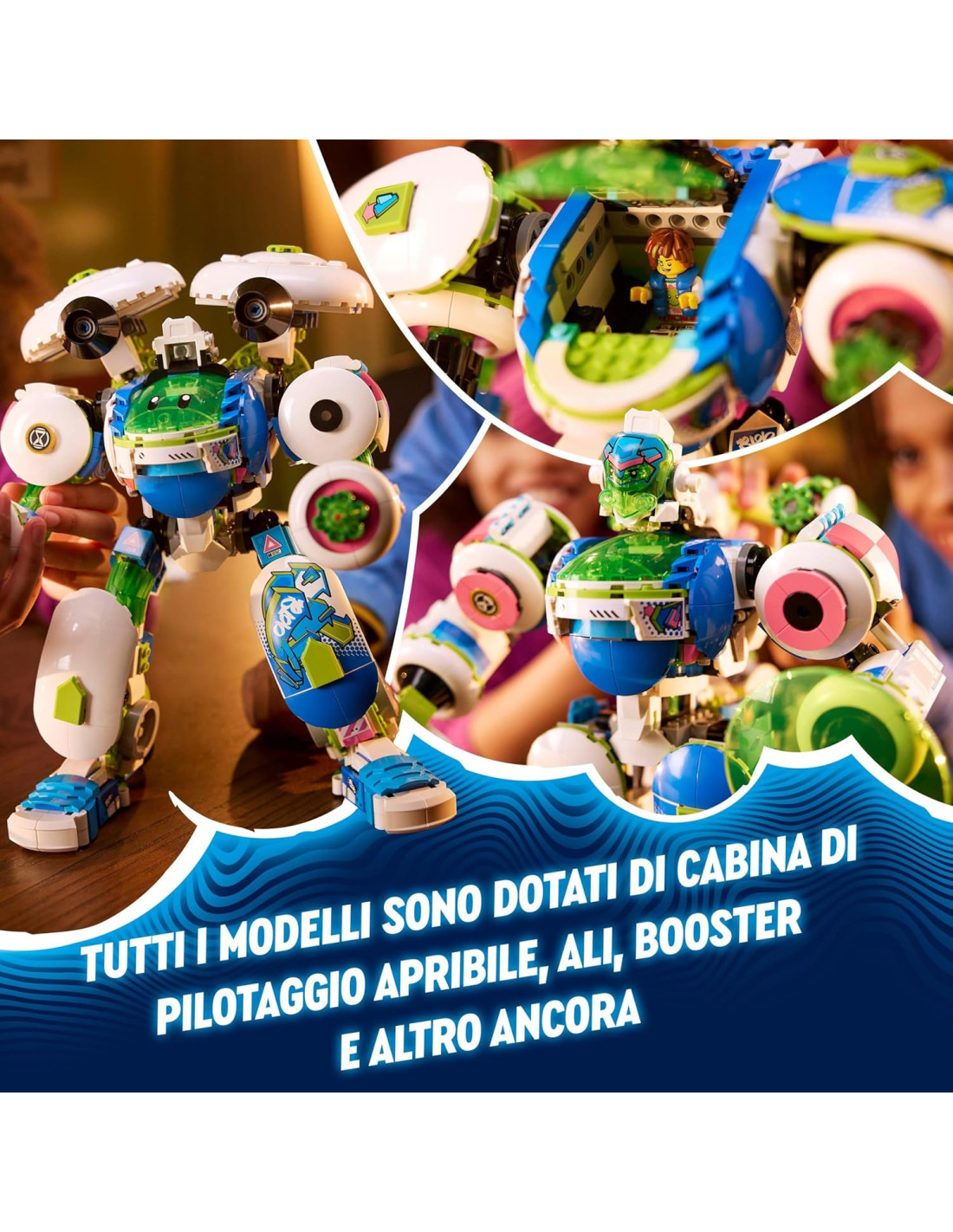 Scatena l'immaginazione dei piccoli con il giocattolo Battle Mech di Mateo e Z-Blob (71485) LEGO DREAMZzz, un gioco creativo per bambini e bambine da 10 anni in su con cui dare vita a tante avventure. Ispirato all'avvincente programma televisivo, questo set di gioco ricostruibile consente ai piccoli di costruire un robot giocattolo LEGO in 3 modi diversi! I giovani sognatori si divertiranno a costruire l'astronave giocattolo di Z-Blob LEGO DREAMZzz per poi trasformarla in uno street mech, o in un centauro o in un battle mech LEGO. Tutti i modelli sono dotati di cabina apribile, ali e booster, oltre ad accessori tra cui una spada, uno scudo, una lancia e 2 shooter a 6 colpi. Questo set di giochi d'avventura contiene anche una figura di corvo e un barattolo dei sogni collezionabile, 4 minifigure dei personaggi LEGO DREAMZzz di Mateo e Logan e i loro oscuri doppelganger Diabo-Teo e Dogan, oltre ai malvagi assistenti Sneak e Snivel. Perfetto per il gioco di fantasia, il robot giocattolo include istruzioni per la costruzione basate sulla storia, che incoraggiano i bambini a immergersi nell'avventura e diventare eroi nel Mondo dei Sogni. Un giocattolo divertente per bambini, ottimo come regalo creativo di compleanno.