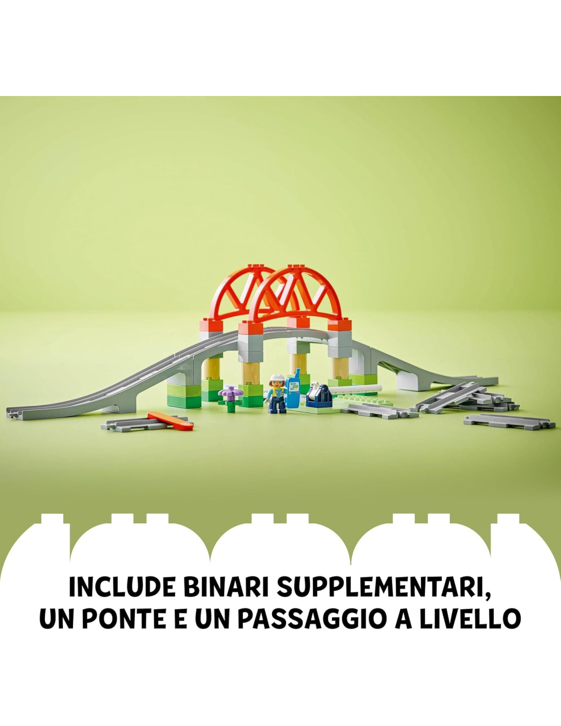 Set con con ponte e binari per treno giocattolo LEGO DUPLO: con il gioco creativo il Pack di Espansione Ponte e Binari Ferroviari, i bambini e le bambine da 2 anni in su ampliano le loro avventure ferroviarie e apprendono preziose abilità Contiene pezzi aggiuntivi per aumentare i tracciati del treno LEGO DUPLO: questo set di giochi educativi include 8 binari, 1 mattoncino multifunzione, un ponte costruibile, un passaggio a livello con barra sollevabile e un ingegnere con telefonino Binari LEGO DUPLO collegabili a tutti i set di trenini giocattolo: questo set è compatibile con i set dei trenini interattivi LEGO DUPLO Town (disponibili separatamente), per espandere ulteriormente i viaggi di apprendimento dei piccoli Idea regalo di compleanno per bambini e bambine: questo Pack di estensione è un gioco didattico affine al metodo Montessori, ottimo come regalo per i fan dei treni giocattolo interattivi LEGO DUPLO, disponibili separatamente Set per lo sviluppo delle abilità: i trenini interattivi ricostruibili LEGO DUPLO, sono veicoli giocattolo progettati per sviluppare le capacità creative dei piccoli, come la risoluzione dei problemi, la pazienza, la concentrazione e la perseveranza Giocattoli di di alto livello per bambini: tutti gli elementi di questo giocattolo LEGO DUPLO sono stati testati al meglio, per soddisfare i severi standard di sicurezza dedicati ai giochi per bambini
