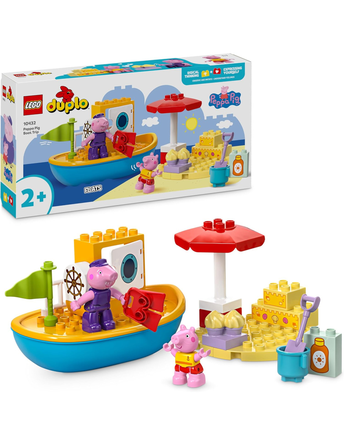 Lascia che i piccoli si divertano con questo set di giochi di Peppa Pig, il Viaggio in Barca di Peppa Pig LEGO DULPLO (10432), per ore di gioioso apprendimento prescolare. Questo gioco creativo per bambine e bambini da 2 anni in su, permette di costruire una barca giocattolo LEGO DUPLO con cui far viaggiare la fantasia dei giovani avventurieri, mentre si divertono in compagnia dei personaggi di Peppa Pig e di Nonno Pig. La barca giocattolo di Peppa è ricca di accessori per ispirare le storie e i giochi di ruolo; i bambini possono aiutare Peppa ad applicare la crema solare prima di andare a caccia di conchiglie, perfezionando le loro abilità di impilamento dei mattoncini tramite la costruzione di un castello di sabbia giocattolo. Se fa troppo caldo, Peppa può ripararsi sotto l'ombrellone o fare una nuotata; i piccoli possono esercitare la coordinazione occhio-mano e le proprie capacità motorie, mentre aiutano Peppa a mettersi le pinne. E se anche loro vogliono rinfrescarsi, possono farlo tranquillamente: la barca LEGO di Peppa Pig galleggia davvero, così anche i piccoli potranno divertirsi per ore con questo colorato gioco da bagno.