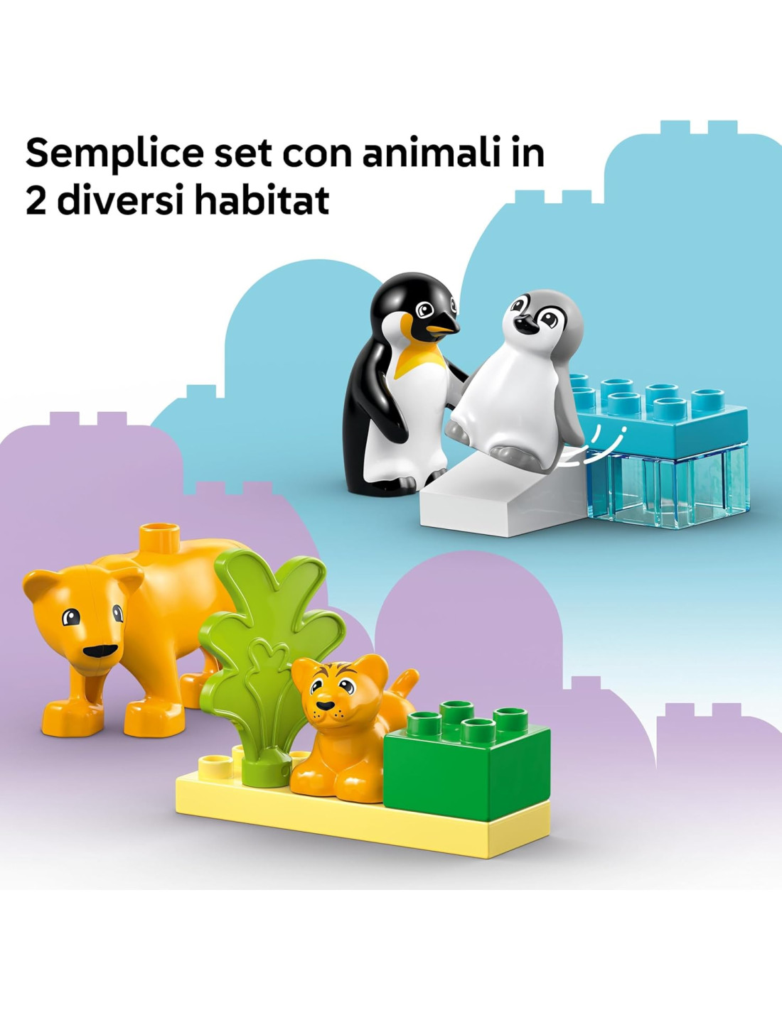 Set LEGO DUPLO con animali per il gioco didattico: i bambini e le bambine in età prescolare da 2 anni in su, potranno sviluppare le abilità sociali, emotive e creative, con il set di giochi di ruolo Famiglie di Animali: Pinguini e Leoni giocattolo Giochi d'avventura a tema natura per le capacità motorie: i piccoli costruiscono una scena nella prateria in cui i leoni possono giocare a fare 'cucù', oltre a realizzare uno scivolo per i pinguini giocattolo Animali giocattolo per bambini: questo set per il gioco di fantasia include 2 habitat in mattoncini e 4 animali LEGO DUPLO: un pinguino adulto, un pulcino di pinguino e una leonessa e il suo cucciolo Costruzioni LEGO che aiutano a imparare attraverso il gioco: arricchisci i momenti di gioco mentre i piccoli si prendono cura dei cuccioli degli animali giocattolo, e imparano a riconoscere le differenze tra grande e piccolo e tra caldo e freddo Regalo creativo per bambini e bambine da 2 anni in su: questo set è un'ottima idea regalo per i piccoli amanti dei playset avventurosi, e dei set socio-emotivi che consentono loro di esprimere empatia verso la natura e gli animali Facili istruzioni da seguire: oltre alle incluse del set, tramite l'app LEGO Builder i piccoli dispongono di una versione digitale delle istruzioni testata per garantire un'esperienza di gioco sicura Set di gioco prescolari per lo sviluppo delle competenze: i set LEGO DUPLO sono progettati per supportare lo sviluppo dei bambini aiutandoli a imparare attraverso il gioco in modo divertente e coinvolgente