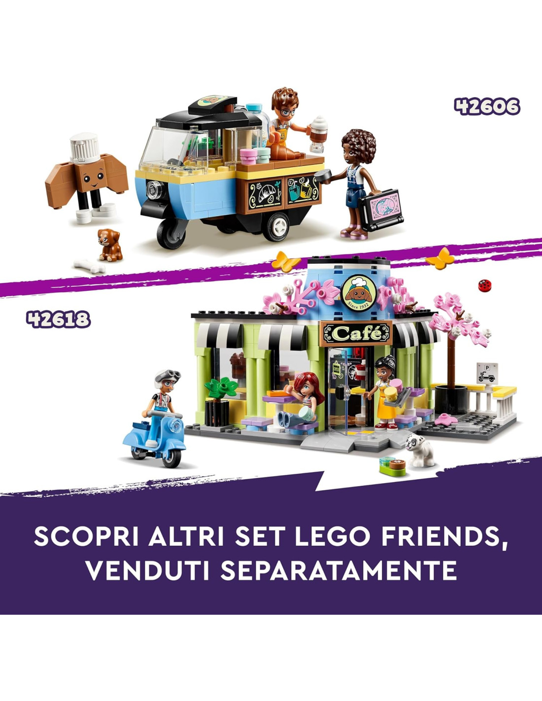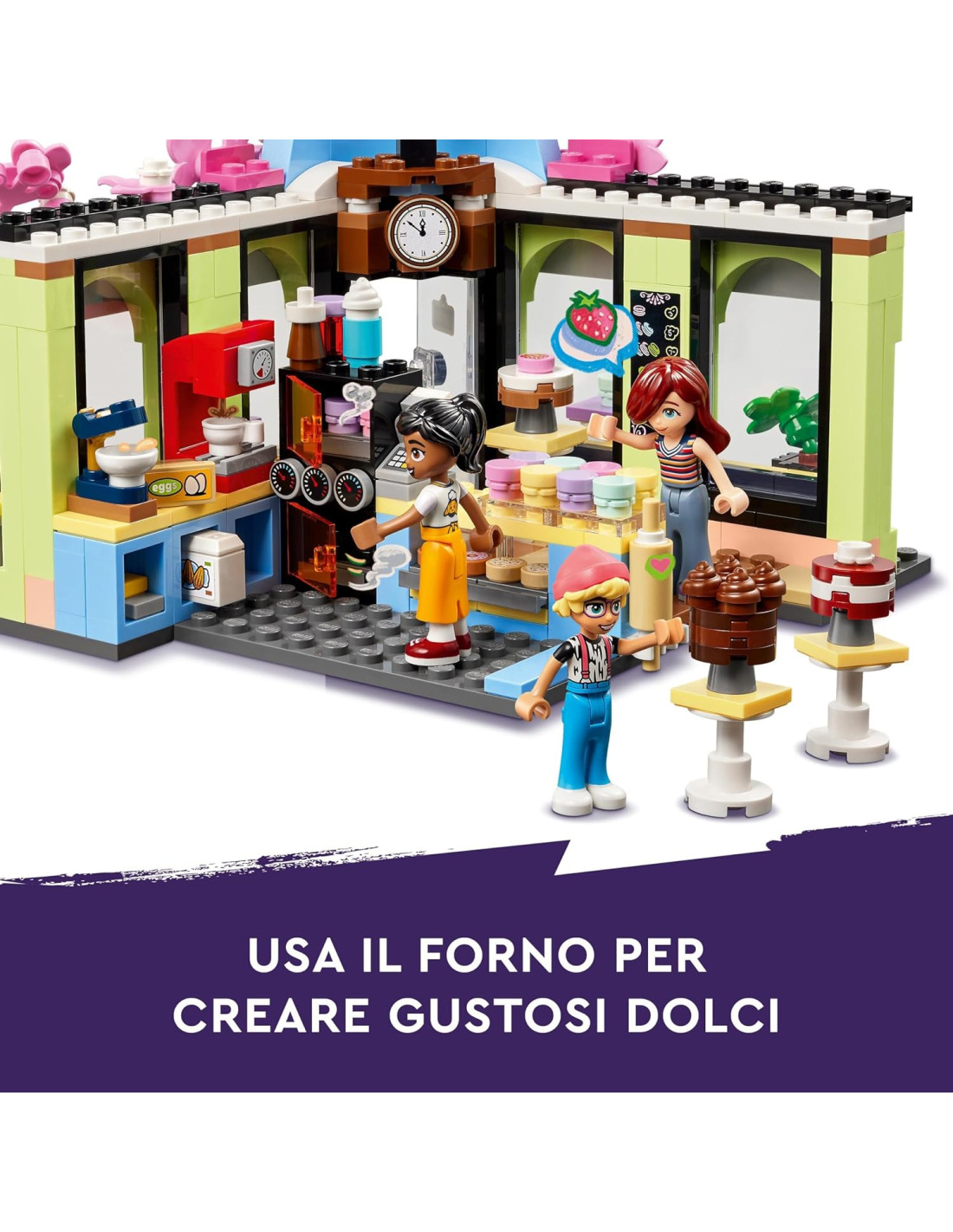 Ecco una dolce idea regalo che consente ai bambini dai 6 anni in su di creare le loro storie di amicizia. Il giocattolo Caffè di Heartlake City LEGO Friends (42618) per bambini contiene una caffetteria in stile pasticceria e 3 mini-doll LEGO Friends e un cane. Ci sono anche una serie di accessori a tema caffè nell'edificio per stimolare il gioco di fantasia di bambini e bambine. Questo giocattolo per lo sviluppo sociale racconta la storia di Paisley e Olly mentre visitano il loro caffè preferito a Heartlake City. Beatriz smista i macarons sui vassoi e prepara le torte in cucina, dove ci sono un forno giocattolo e una macchina per il caffè. Poi aiuta gli amici a scegliere i dolcetti da gustare all'aperto prima di riporre i macarons nella scatola, pronta per effettuare le consegne sul suo scooter. Scopri altre idee regalo per il compleanno dei bambini nell'universo LEGO Friends, dove troverai tante altre storie di amicizia (set disponibili separatamente). Questo set contiene l'app LEGO Builder per una costruzione intuitiva. Qui i bambini possono ingrandire e ruotare i modelli in 3D, salvare set e tenere traccia dei progressi.
