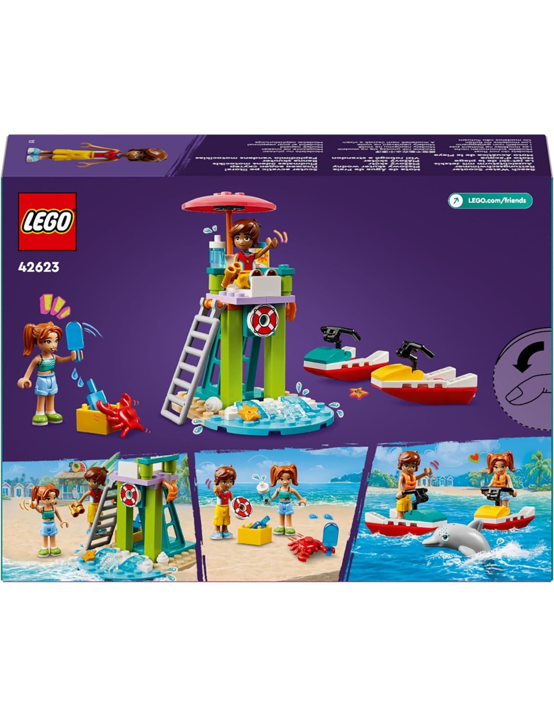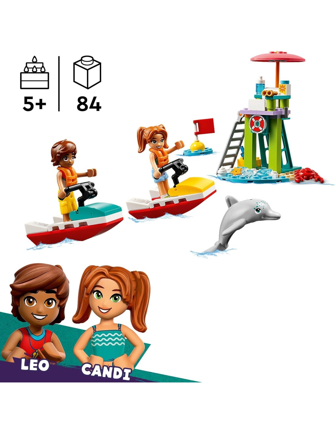 Lascia che i bambini creino divertenti avventure sull'oceano con il giocattolo Moto d'acqua LEGO Friends (42623) per i bambini dai 5 anni in su. Il set include 2 mini-doll, un delfino e accessori per ispirare il gioco di fantasia. Questo set LEGO del bagnino contiene 2 moto d'acqua giocattolo così i bambini possono raccontare la storia. Leo è di turno come bagnino e usa il binocolo per sorvegliare l'oceano. È la postazione perfetta anche per avvistare i delfini. Più tardi si unisce a Candi e agli altri amici che gareggiano sulle moto d'acqua. I bambini adoreranno i piccoli dettagli, come il granchio a cui piace saccheggiare il frigorifero per guastare i deliziosi ghiaccioli! Scopri altre idee regalo per i bambini nell'universo LEGO Friends (set disponibili separatamente), dove troverai tantissime opportunità per raccontare storie mentre i bambini ricreano avventure nella vita reale. Questo set di costruzione contiene l'app LEGO Builder per un'esperienza di costruzione facile e intuitiva. Qui i bambini possono ingrandire e ruotare i modelli in 3D, salvare set e tenere traccia dei progressi.