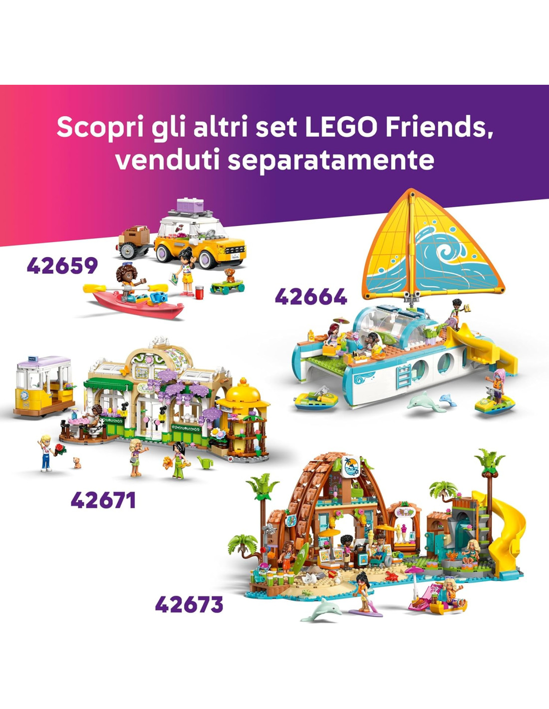 Con 2 mini bamboline e un animale giocattolo: contiene i personaggi LEGO Friends di Leo e Liann e il gatto giocattolo Churro, con cui dar vita a storie di amicizia e feste in piscina