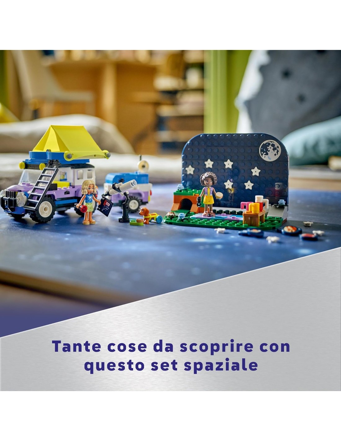 I piccoli che amano i giochi d'avventura hanno tanto da scoprire, con il playset LEGO Friends Camping-Van Sotto le Stelle (42603), un set di giochi per bambine e bambini da 7 anni in su, per tanto divertimento all'aria aperta. Il set include un telescopio giocattolo, un modellino di auto 4x4 da costruire con roulotte e tenda pieghevole, le 2 mini bamboline dei personaggi LEGO Friends di Aliya e Nova, un cane giocattolo e un riccio. Ispira i giochi scientifici dei bambini con questo set da campeggio, e aiutali a creare le costellazioni sullo sfondo usando le tessere LEGO con i disegni dei pianeti e delle stelle. Questa costruzione per bambini comprende diversi accessori con cui dar vita a storie di amicizia, tra cui tazze, biscotti, biscottini per cani, un binocolo, un telescopio, una torcia elettrica, un tablet, stelle aggiuntive e stampe di diversi pianeti per la personalizzazione. Questo set di costruzioni LEGO è un divertente regalo di compleanno per i bambini che amano i giocattoli di esplorazione scientifica. I giovani possono sperimentare un modo facile di costruire tramite l'intuitiva app LEGO Builder, che offre strumenti per ingrandire e ruotare i modelli in 3D, per salvare i set e per monitorare i progressi fatti.
