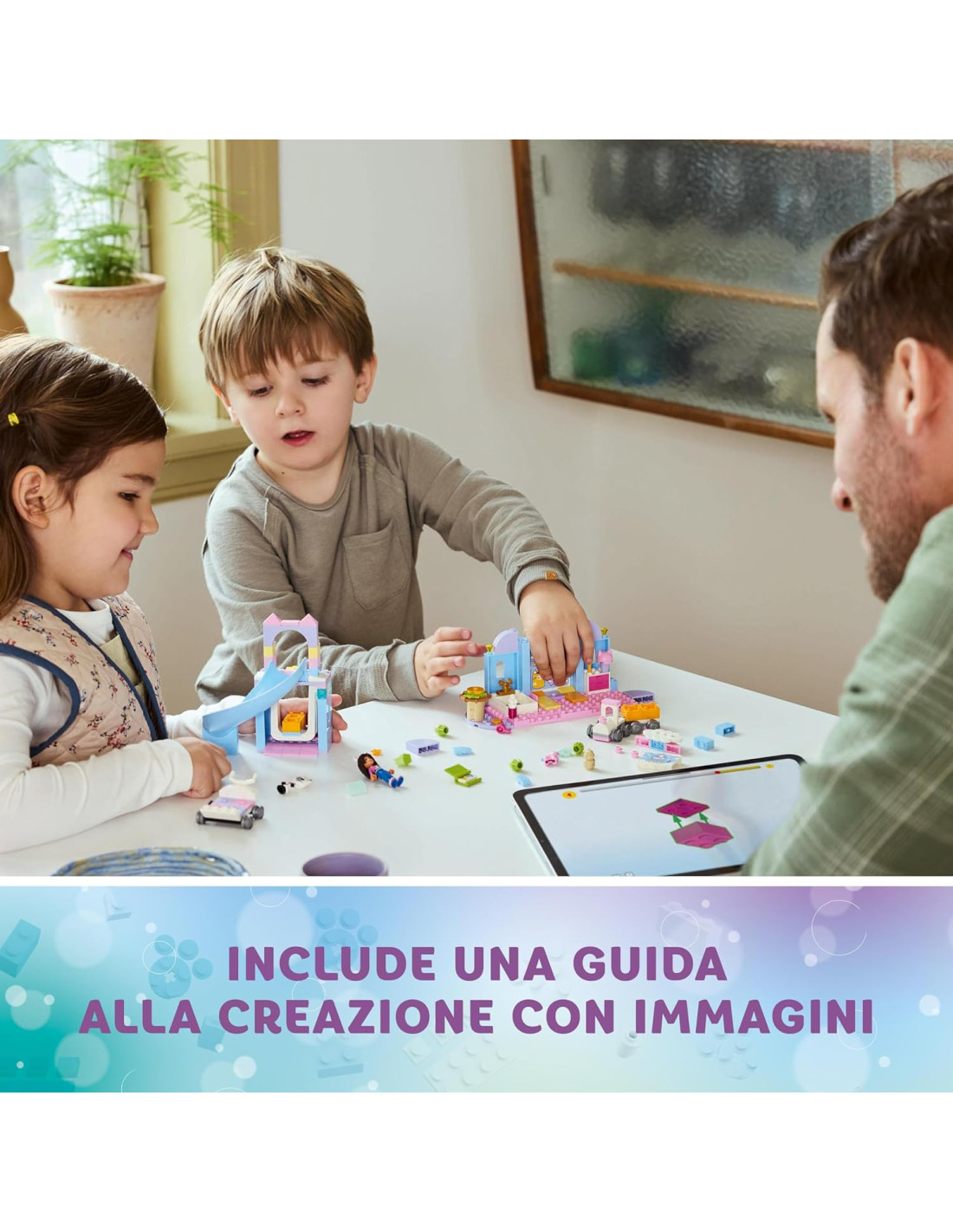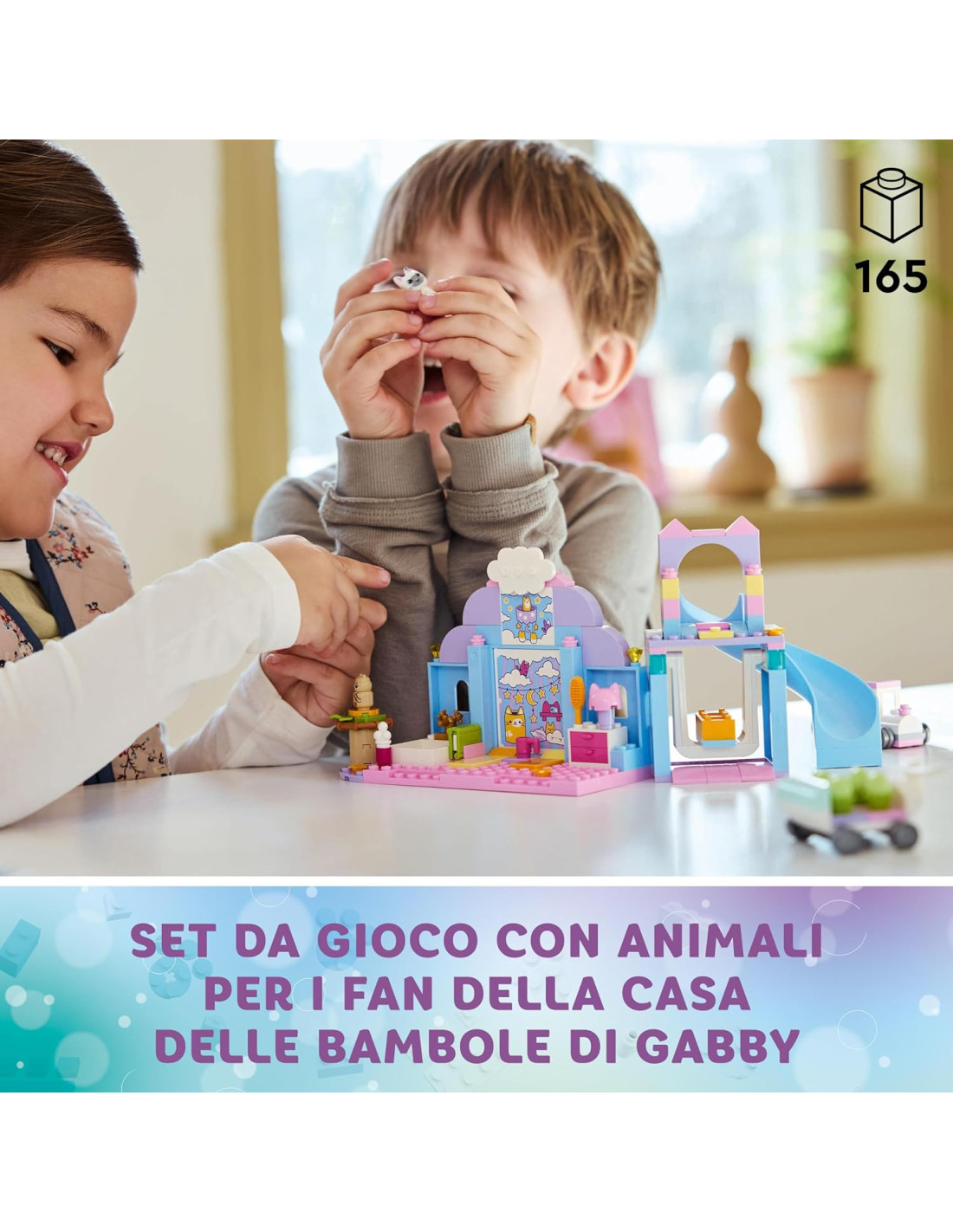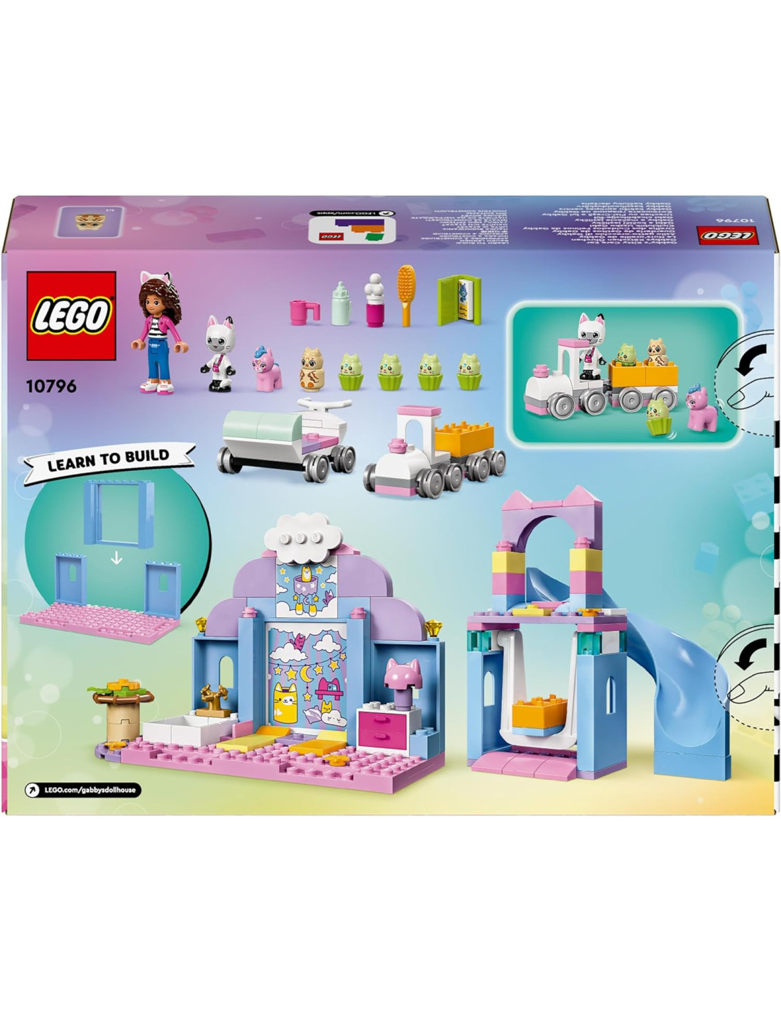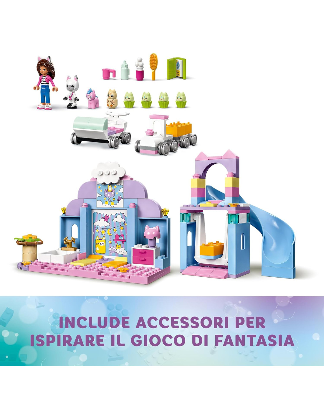 Il set Asilo gatto-orecchio di Gabby (10796) è un giocattolo di finzione ed educativo per i fan di 4+ anni de La casa delle bamboledi Gabby di DreamWork Animation. Questo giocattolo prescolare per i bambini e le bambine è un fantastico modo per acquisire sicurezza, migliorare la concentrazione e sviluppare capacità di risoluzione dei problemi divertendosi tantissimo! Se stai cercando un regalo per un bambino in età prescolare che ama prendersi cura degli animali, questo playset con casa delle bambole è il giocattolo di intrattenimento che fa per te. Include una mini-doll di Gabby e di Pandy Panda, Piccolo Gattocorno, Baby Miao Gufo e 4 Piccoli Cupcake. Il set da gioco contiene un'altalena, uno scivolo, un trenino e un passeggino a forma di cupcake a 4 posti. C'è un bagno con accessori, tra cui shampoo e spazzola per capelli. Sono inclusi un biberon, una tazza, un libro di fiabe e una selezione di comodi letti (tra cui un nido per Baby Miao Gufo) per garantire un pisolino rilassante. Il set include infine uno Starter Brick per aiutare i bambini a iniziare la costruzione. Le istruzioni intuitive sono fornite sotto forma di una colorata guida con storie illustrate.
