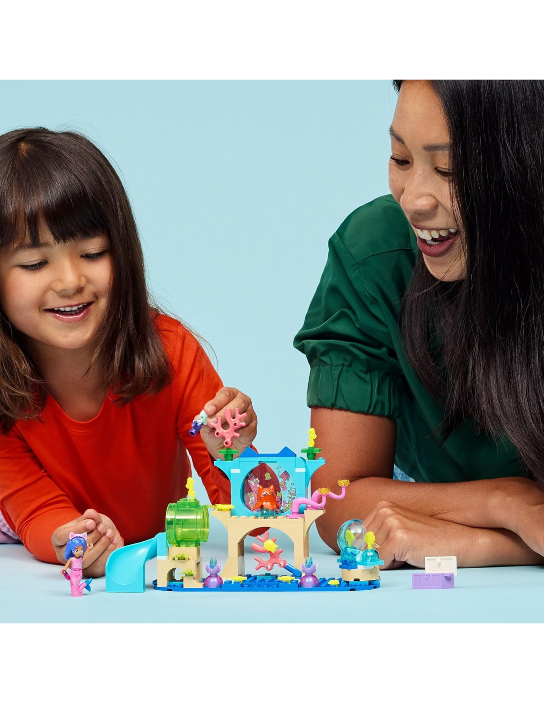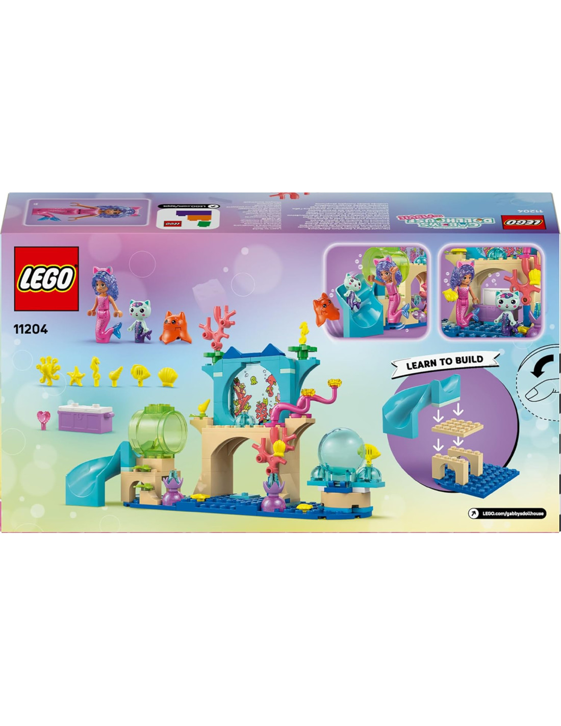 La Casa delle Bambole di Gabby - Il film: questo gioco di ruolo contiene una mini bambolina di Gabby vestita da sirena, le figure di Siregatta e della medusa, e uno Starter Brick per un rapido assemblaggio Giocattolo con accessori per la casa delle bambole: include conchiglie, piante, animali marini, uno scivolo, una bolla gigante in cui far “galleggiare” i personaggi, e un corallo che nasconde un tesoro Personaggi di Gabby: i piccoli possono ricreare le storie della serie DreamWorks Animation di Gabby; questo set si può aggiungere al set 11205 (disponibile separatamente), per creare i tre mondi raffigurati nel film