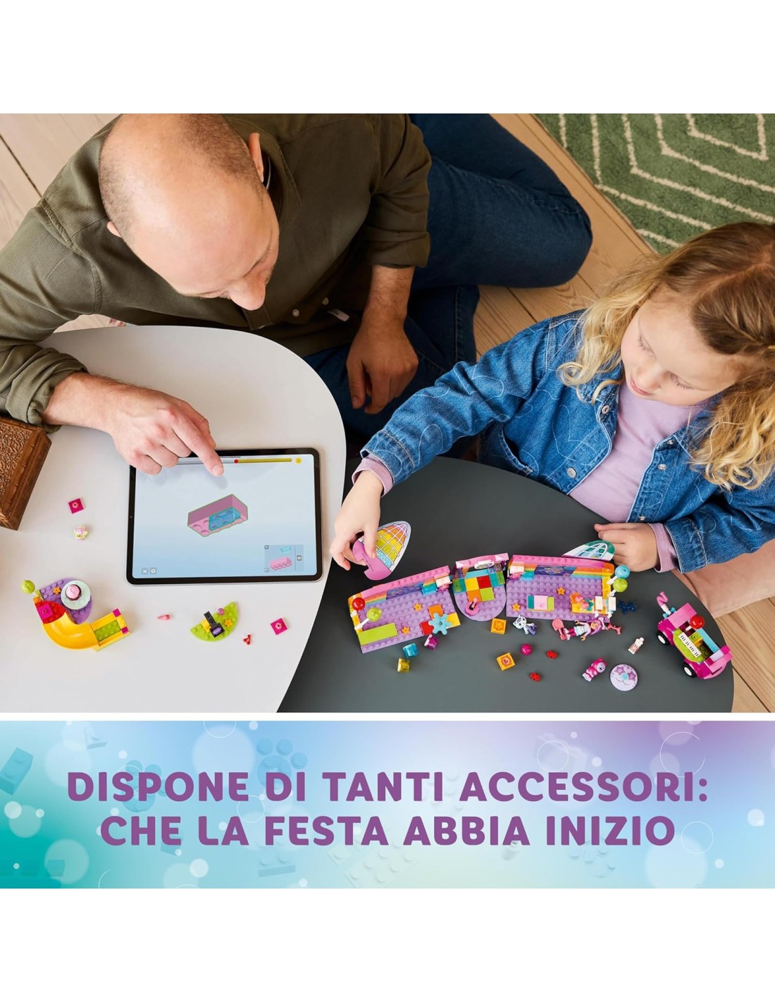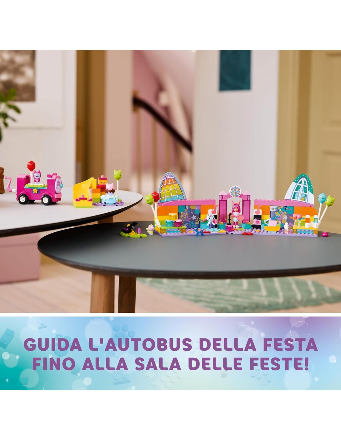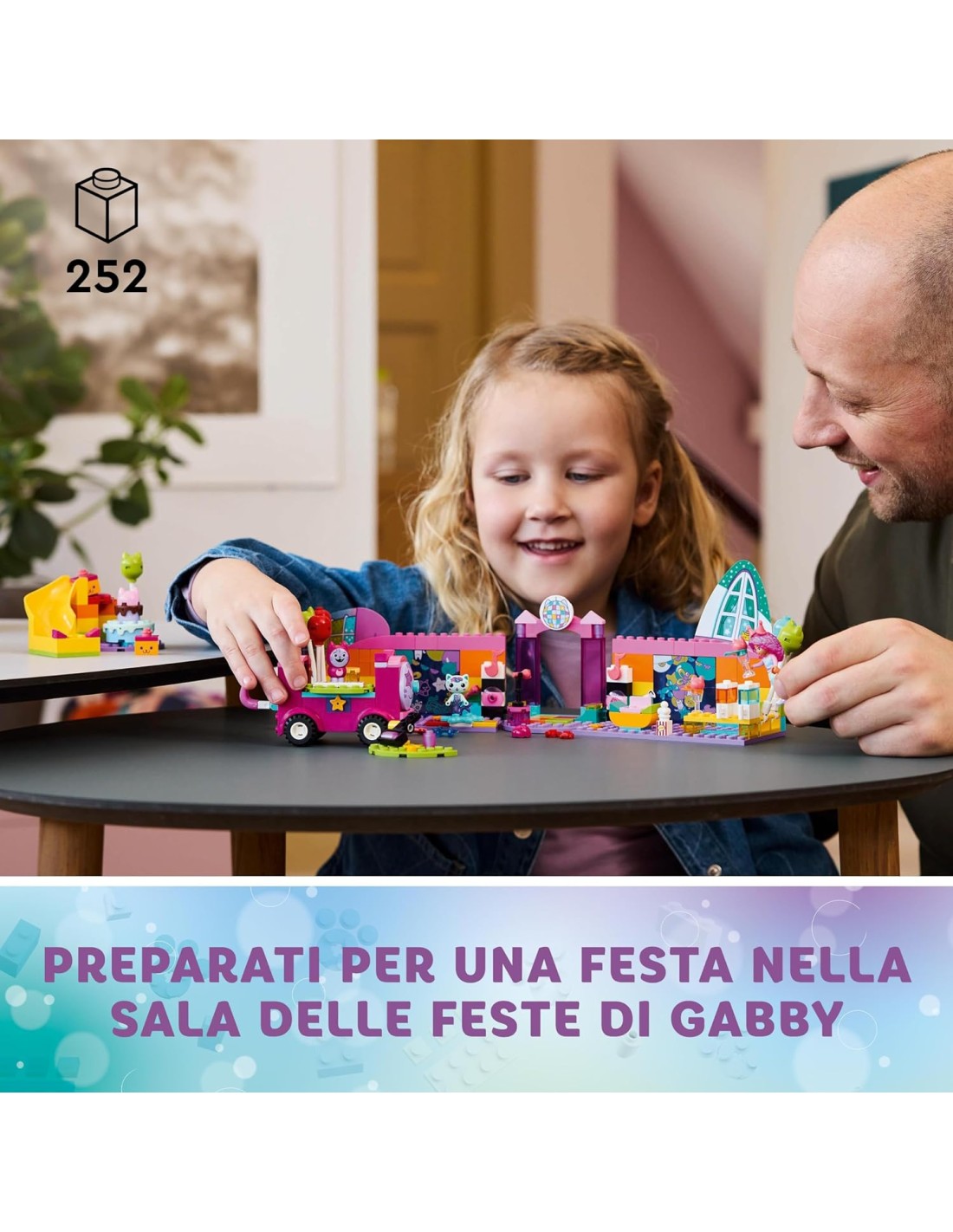 La stanza della festa di Gabby (10797) è il set di gioco della discoteca definitivo per i fan de La casa delle bambole di Gabby DreamWorks Animation. Questo giocattolo di intrattenimento per bambini incoraggia lo sviluppo della sicurezza di sé, la concentrazione e le capacità di risoluzione dei problemi nei bambini in età prescolare dai 4 anni in su. Questo giocattolo per i bambini e le bambine è un entusiasmante playset con discoteca e molto altro ancora! Con i personaggi di Gabby, Daniel James “DJ” Catnip, Gattina Fatina e Siregatta e una varietà di giocattoli musicali per le feste, tra cui un party bus a spinta con tastiera incorporata, una pista da ballo girevole, chitarra, 2 microfoni e una scintillante palla da discoteca, il palcoscenico è pronto per un gioco di fantasia senza fine! Gli accessori includono palloncini e pattini a rotelle per la discoteca, popcorn e 2 bicchieri pieni di granita per la zona relax, lattine e una catapulta per giocare ad abbatterle. Ci sono una torta per Gabby e pacchetti con regali all'interno che vengono consegnati lungo lo scivolo del set da gioco. Il set contiene un grande Starter Brick per aiutare i bambini a iniziare a costruire. Una colorata guida illustrata fornisce istruzioni intuitive.