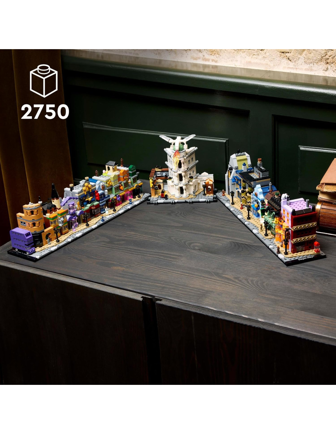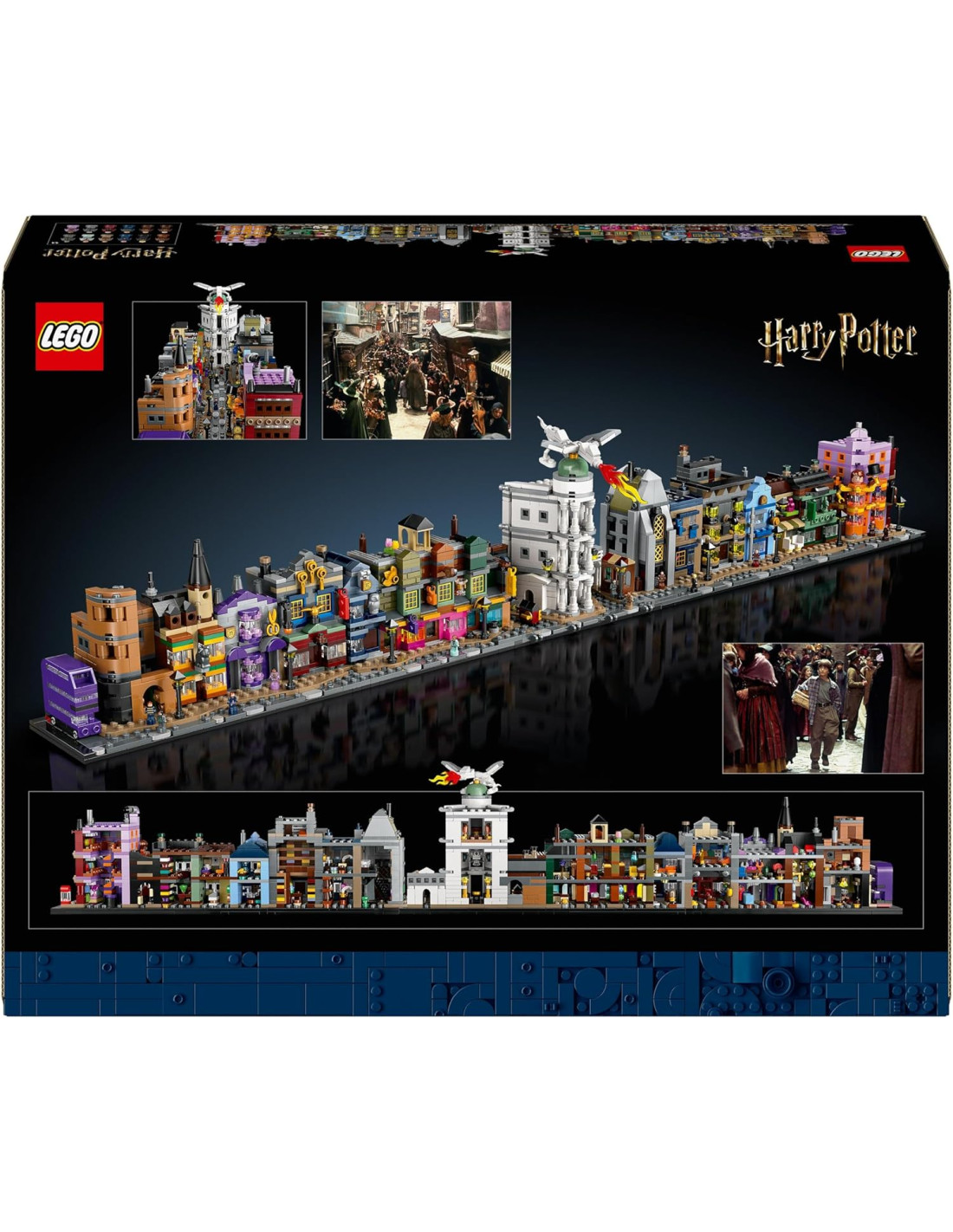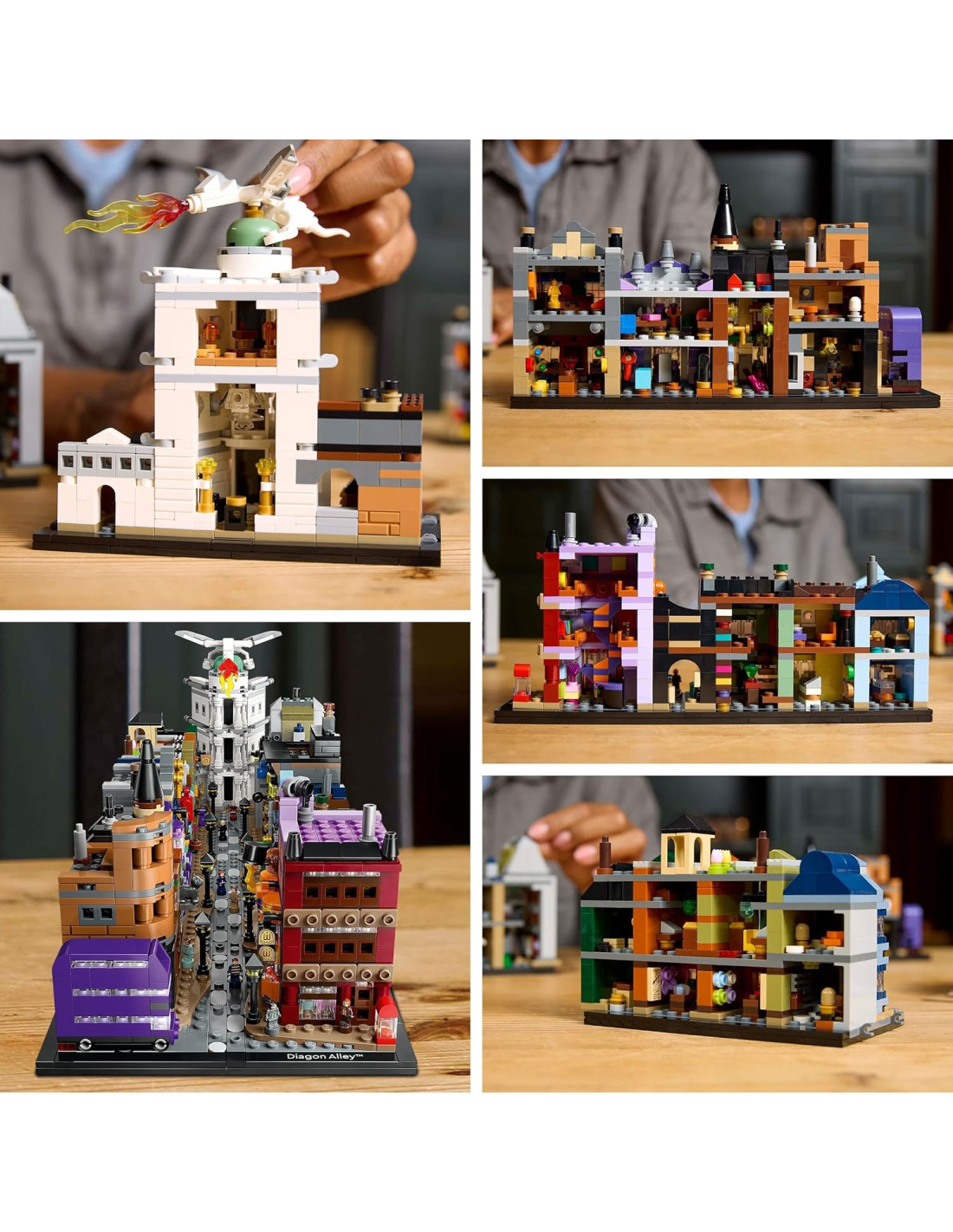 LEGO Harry Potter: Harry Potter, Ron Weasley, Hermione Granger, Fred Weasley, George Weasley, Lavanda Brown, Ginny Weasley, Draco Malfoy, Narcissa Malfoy, Signor Borgin e altri 16 modelli di mini-negozi Diagon Alley: crea versioni in microscala delle iconiche ambientazioni, come l'Emporio del Gufo di Eeylops, la Banca dei maghi Gringott, il Paiolo magico e il quartier generale della Gazzetta del Profeta, oltre a Nottetempo