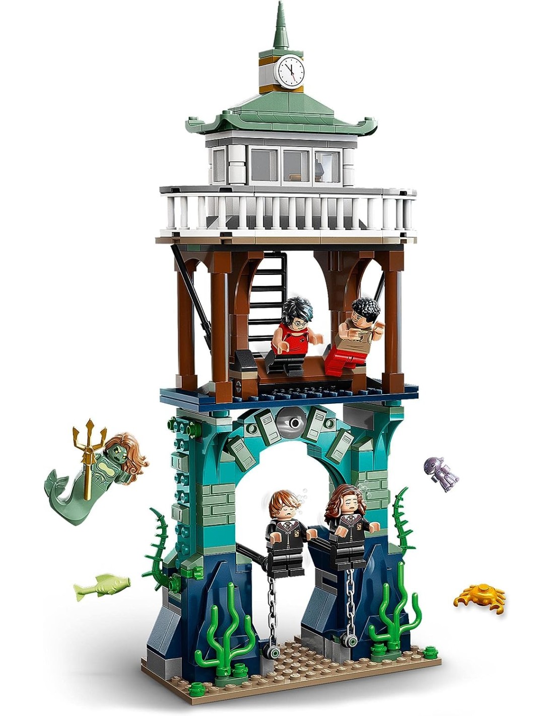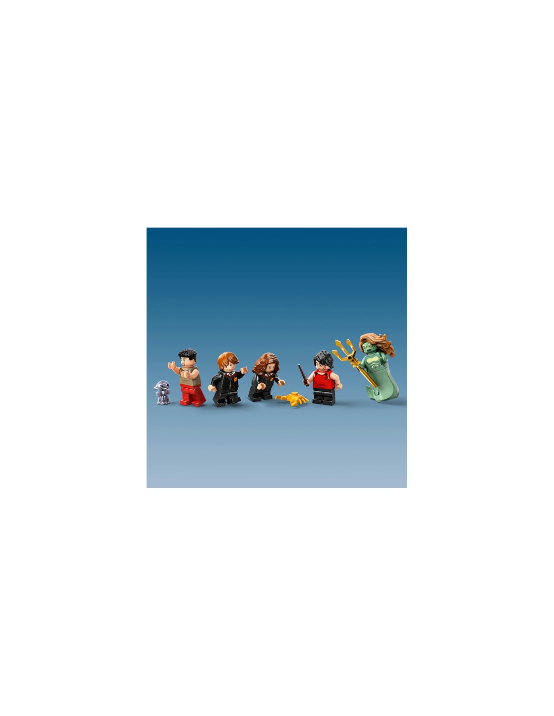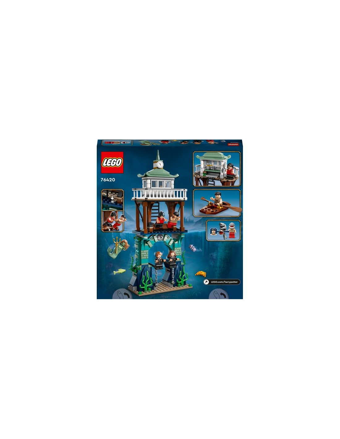 È presente anche un modello di molo, con funzione di immersione della minifigure, che può essere posizionato sopra la scena sott'acqua. Personaggi leggendari Dai vita a una scena classica di Harry Potter e il Calice di Fuoco con 5 minifigure LEGO, tra cui Harry Potter con elementi pinna e Viktor Krum con un elemento testa di squalo per aiutarli a salvare Hermione Granger e Ron Weasley.