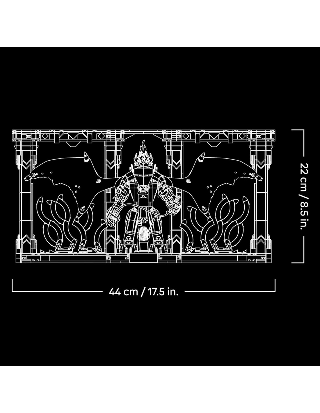 Kit di modellismo fai da te: il set comprende un personaggio del Balrog con una frusta infuocata, posizionato contro un ardente muro di fiamme, e una minifigure LEGO di Gandalf il Grigio con bastone e spada